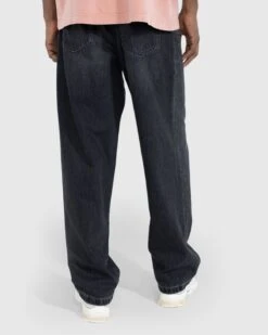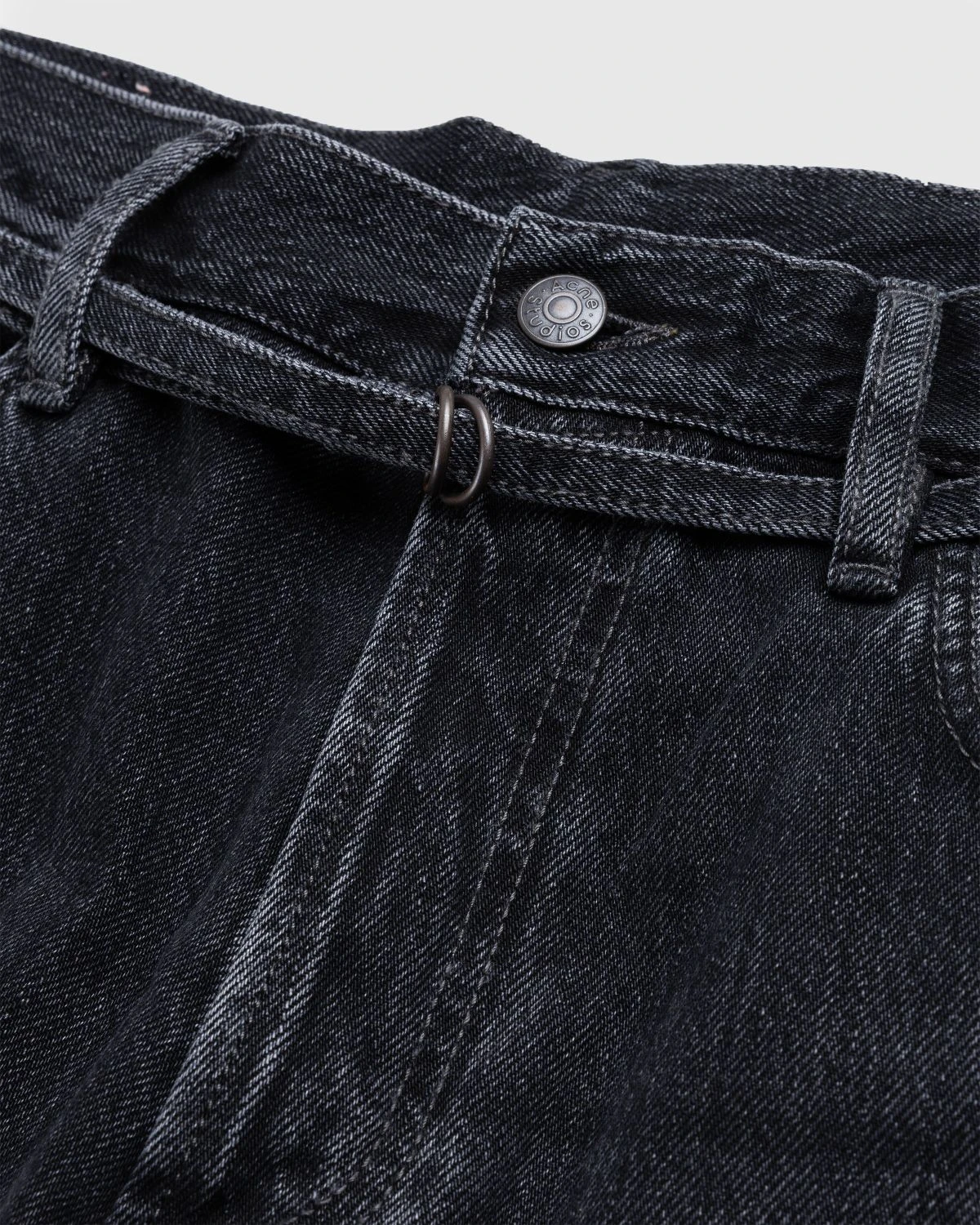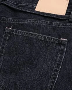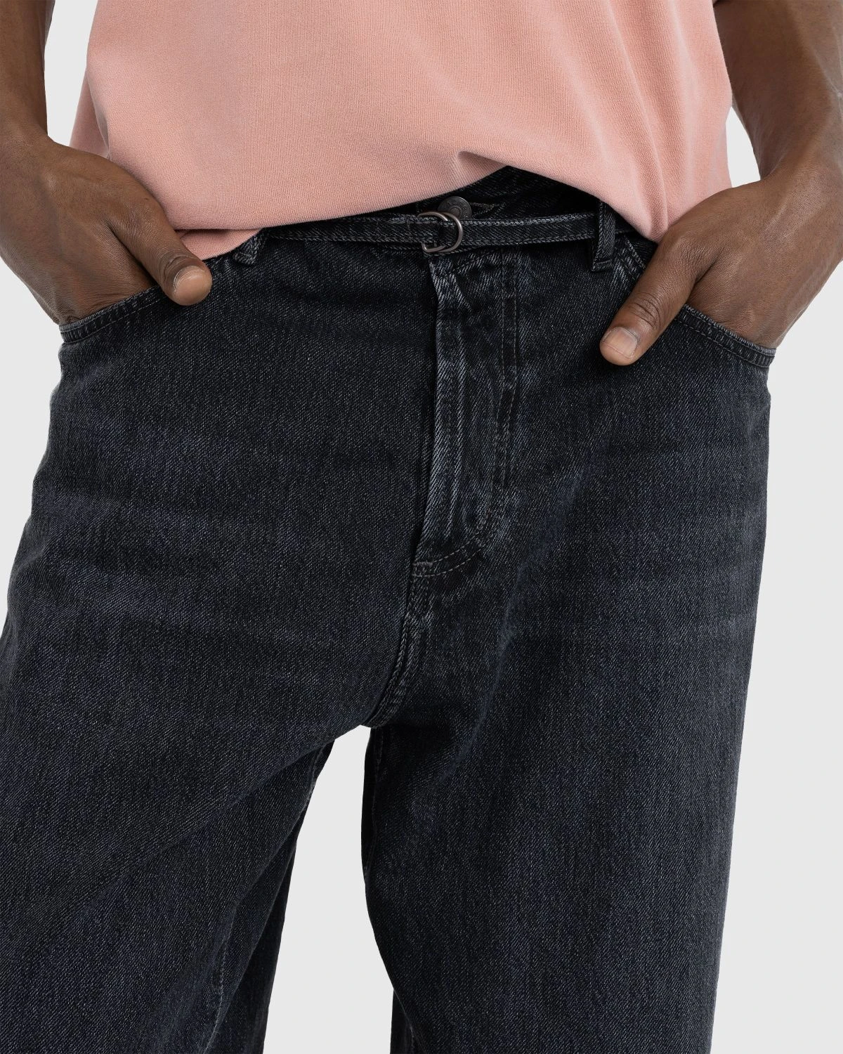 Main material is 100% organic cotton. Rigid denim. Five-pocket construction. Adjustable belt. Button fly. Belt loops. Leather logo patch at the back waist. Unisex.