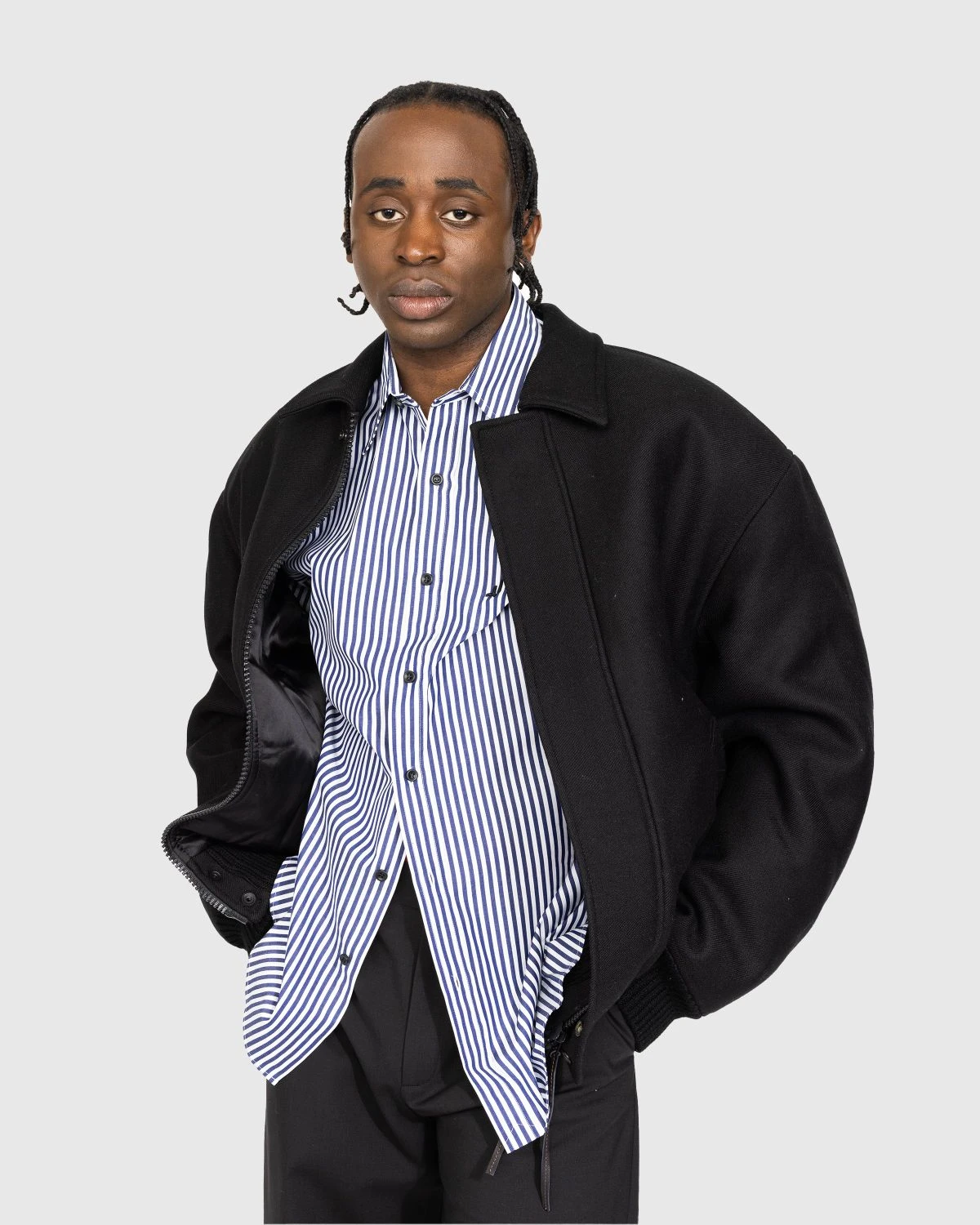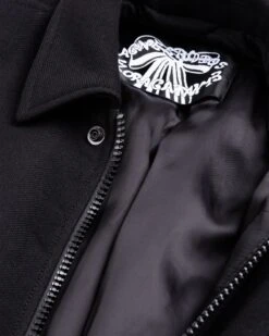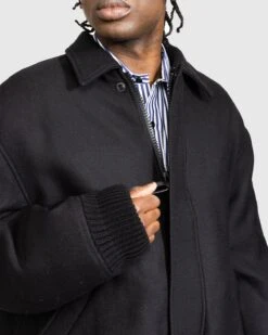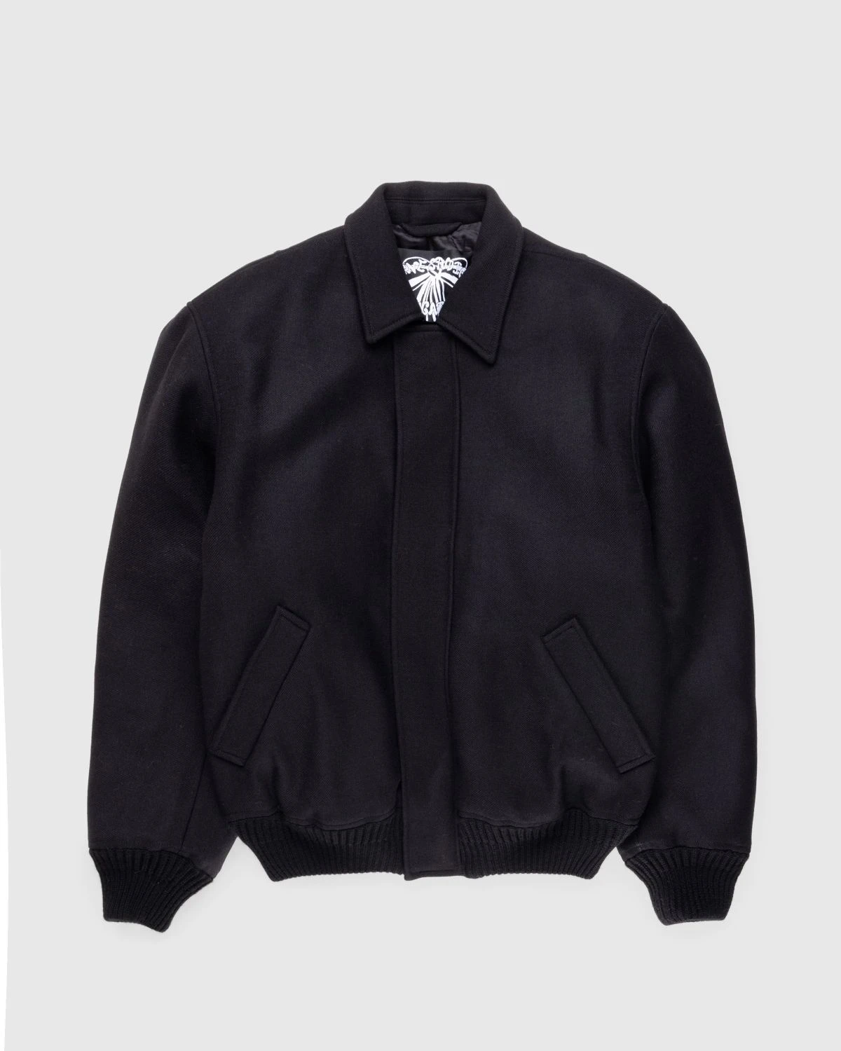 Acne Studiosβ penchant for quality fabrics is on full display with its rendition of the classic bomber jacket. Crafted from wool in a monochrome black hue, the timeless jacket features side welt pockets, a hidden zipper closure with snap buttons, and contrasting ribbed cuffs and hem. The jacket arrives in a slightly oversized fit and is finished with the brandβs logo expertly chain-stitched embroidery on the rear.