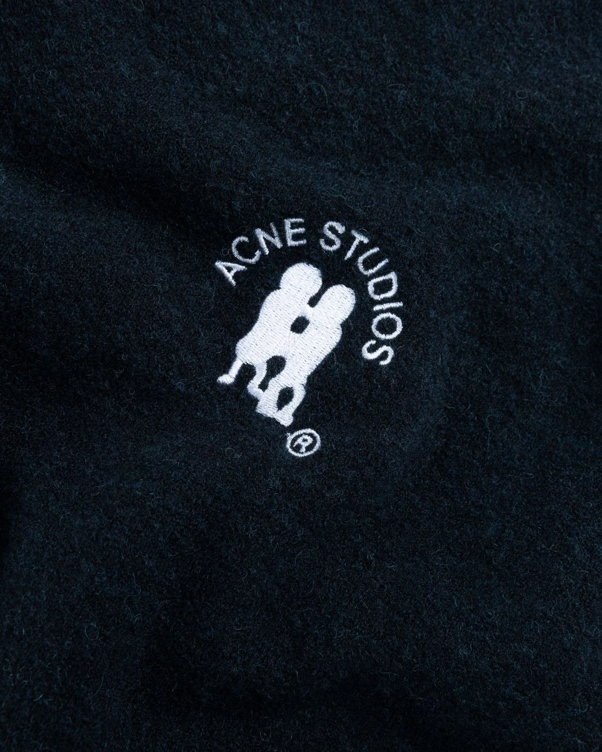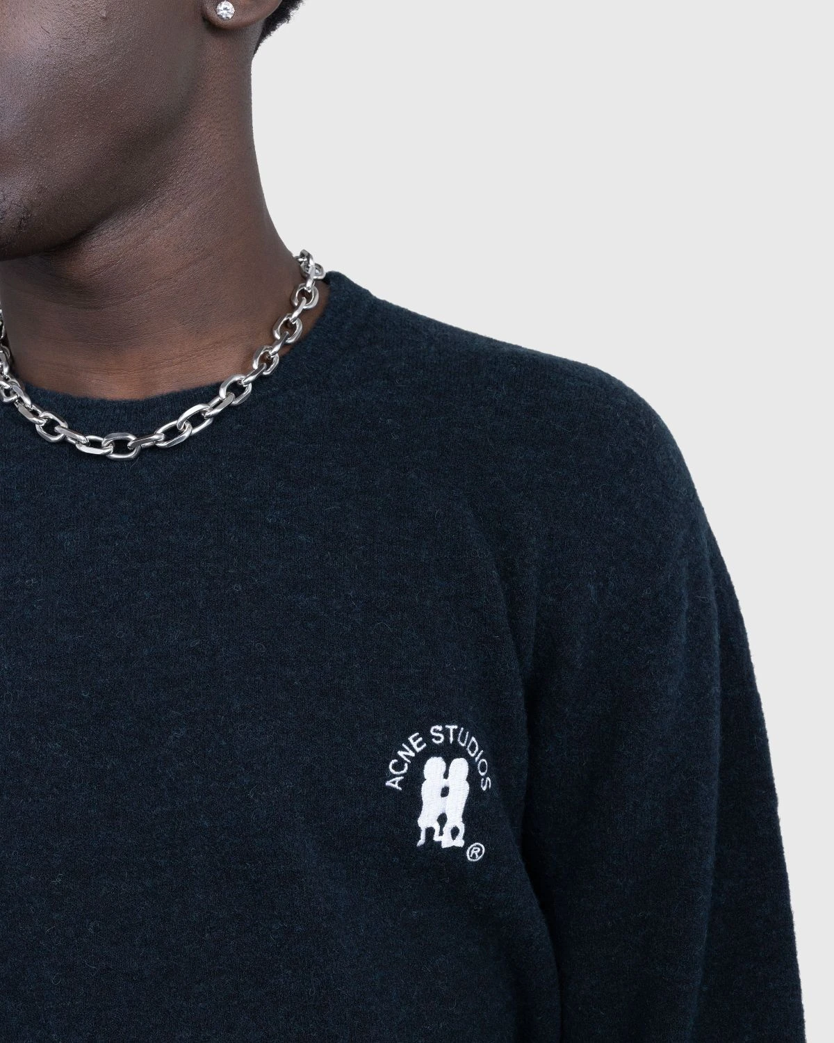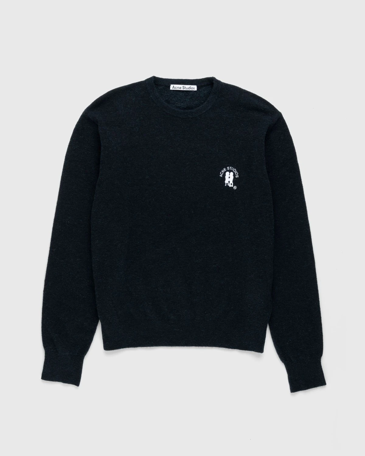 Shell is 47% nylon, 38% wool, 12% alpaca, and 3% elastane. Multi-melange color finish. Ribbed crew neck, cuffs, and hem. Acne Studios embroidery at the left chest.