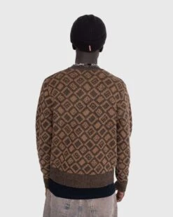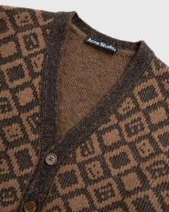 Cardigans donβt have to be boring and this Acne Studios style is anything but. The knitted designβs decorated with a playful motif in all-over fashion. Arriving in a two-tone brown colorway, the wool-cotton blend sweater is made with front button closure and features a ribbed V-neckline, cuffs, and hem. It is a unisex offering that is cut for a regular fit.