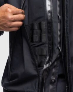 51% cotton. 44% nylon. 5% elastane. Schoeller Shape 3XDry fabric technology. 2-way stretch. Water-repellent, moisture-wicking, fast-drying, and highly breathable. Ultra-strength tactical webbing. Front zip closure allows for easy access to the hidden interior panel. Removable ForceLock, JacketSling, and logo tape. Four external pockets. One internal pocket.