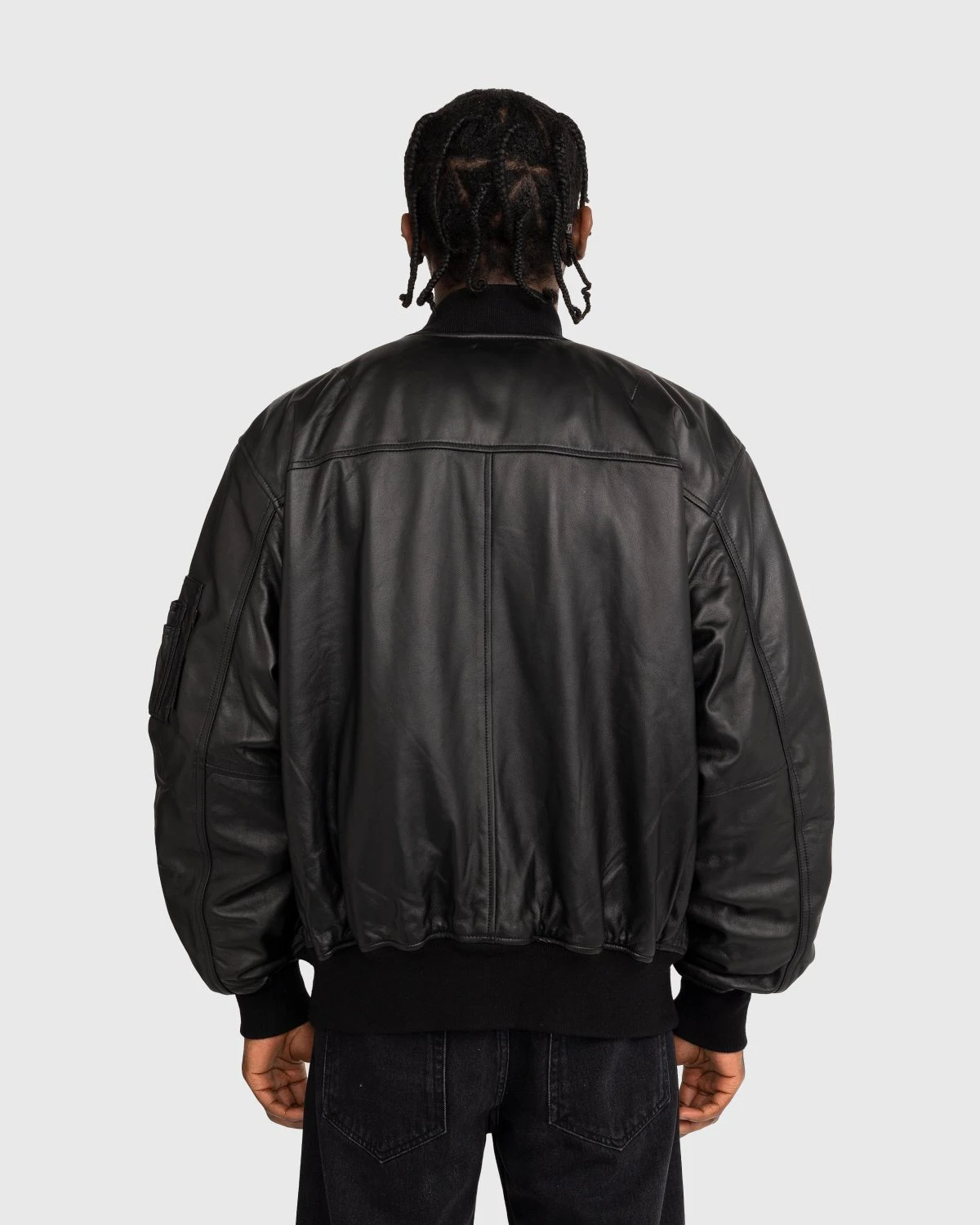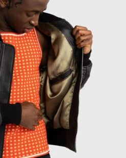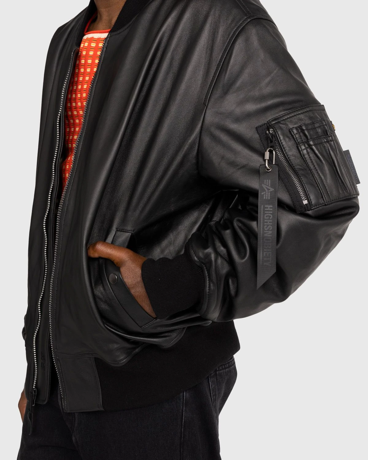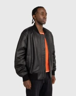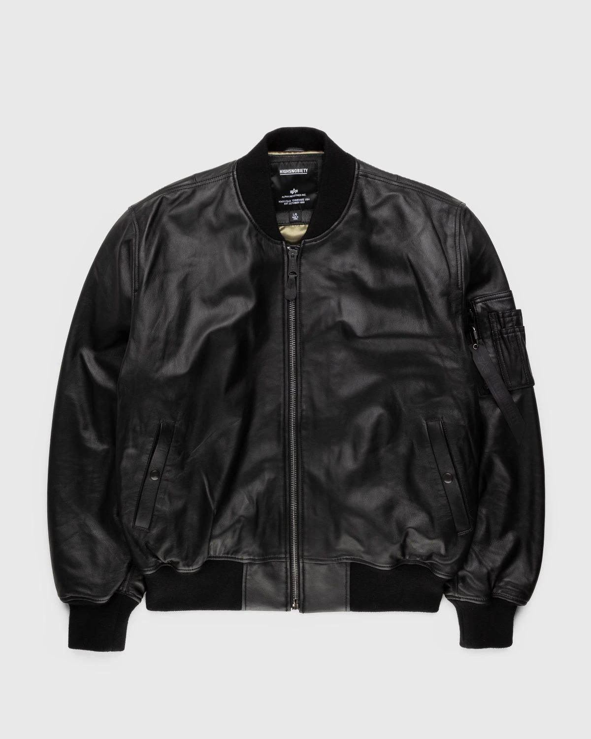 The Alpha Industries x Highsnobiety Leather MA-1 is a limited-edition redesign of the iconic bomber giving a more boxy and voluminous fit. The outer shell features premium napa leather, an unsplit sheepskin that provides a durable and buttery finish. This is contrasted by a soft satin green lining that references the jacket’s military history. Further detailing comes in the form of custom black hardware, debossed branding on the storm flap, and a co-branded, removable flight zipper pull on the sleeve.