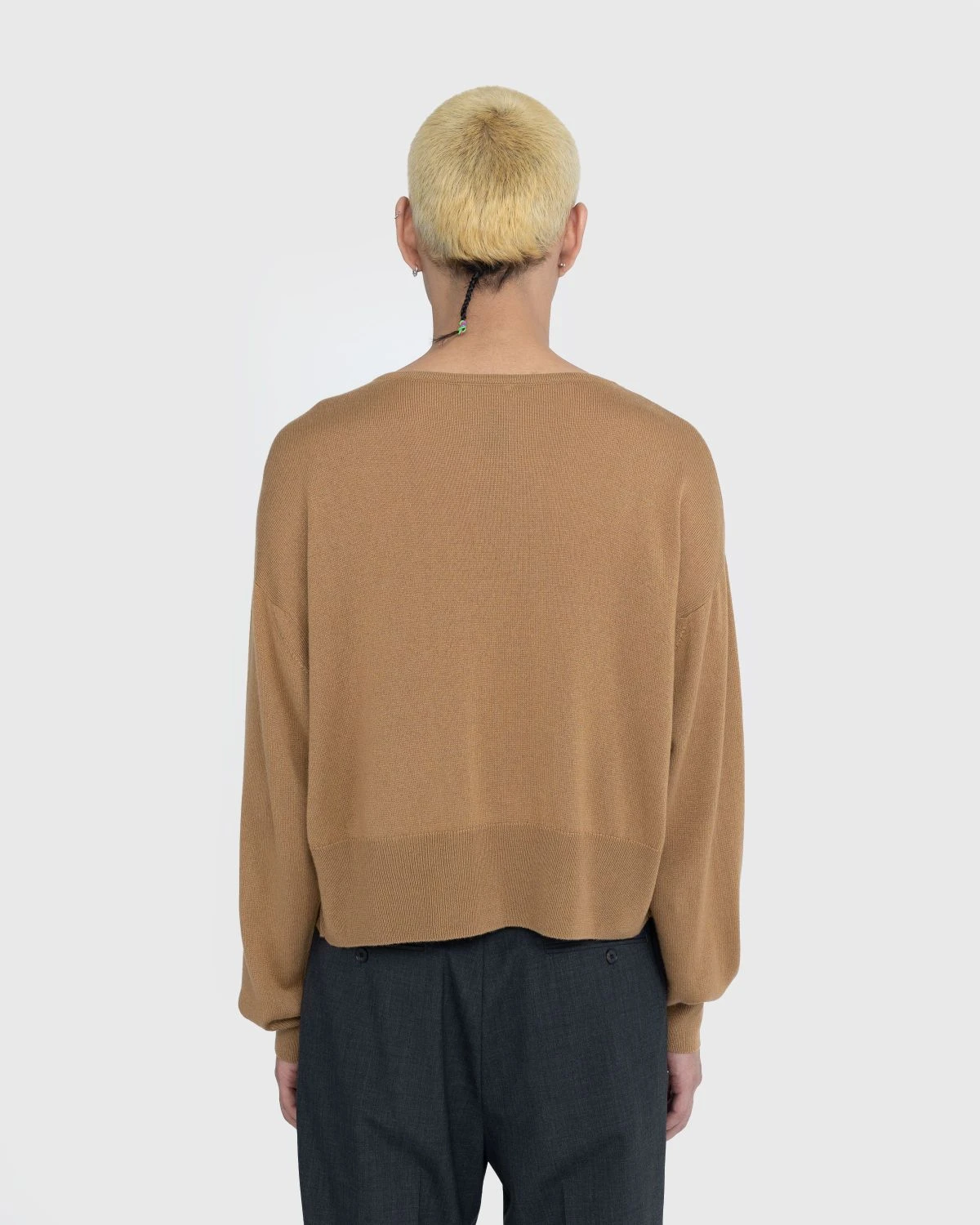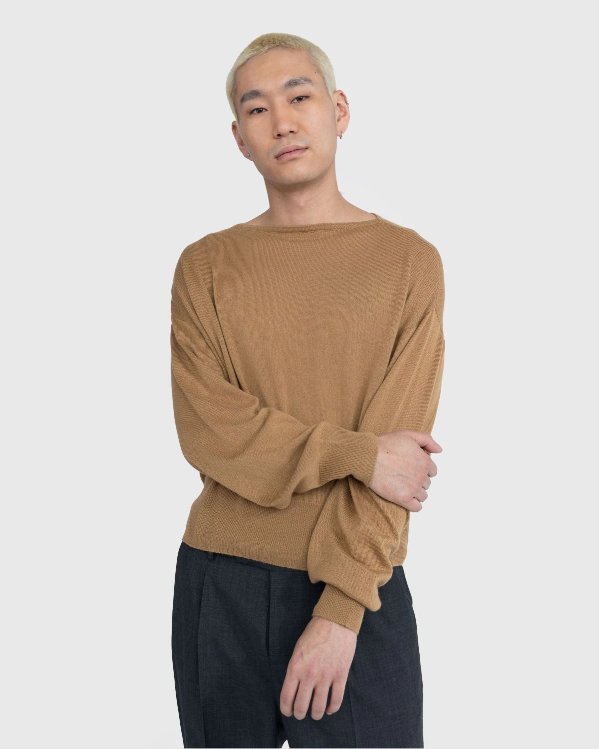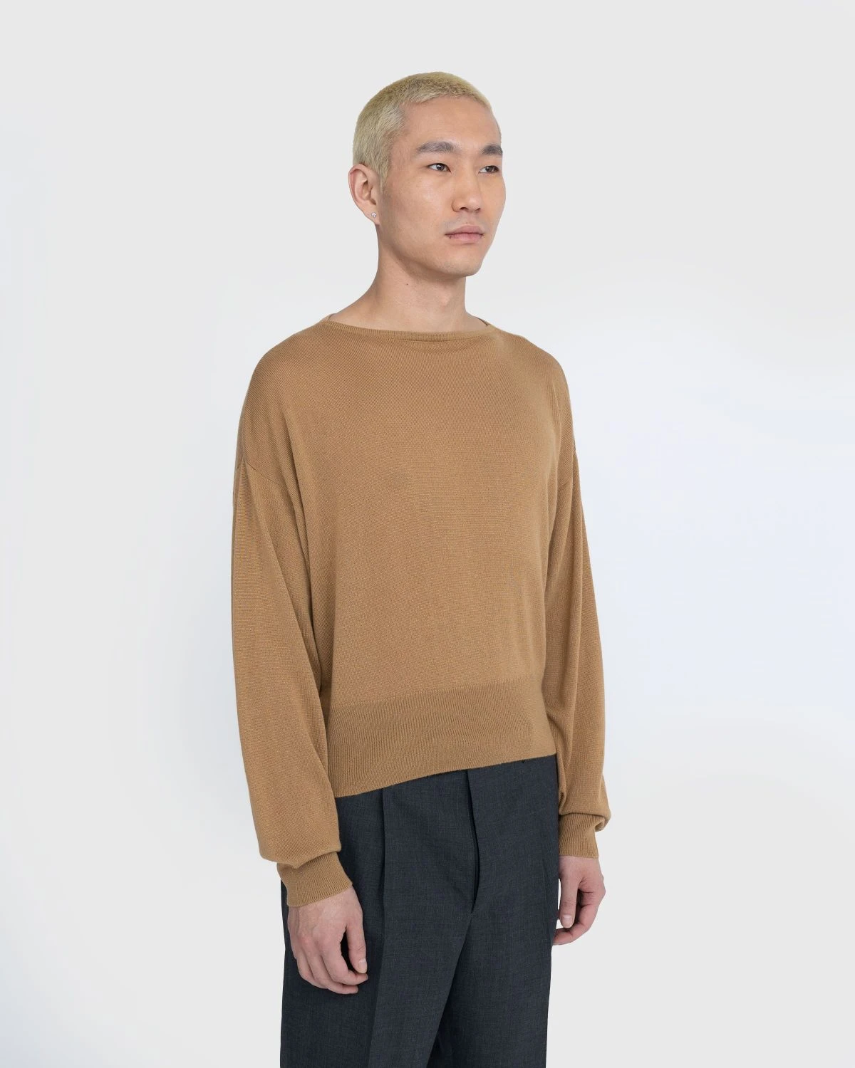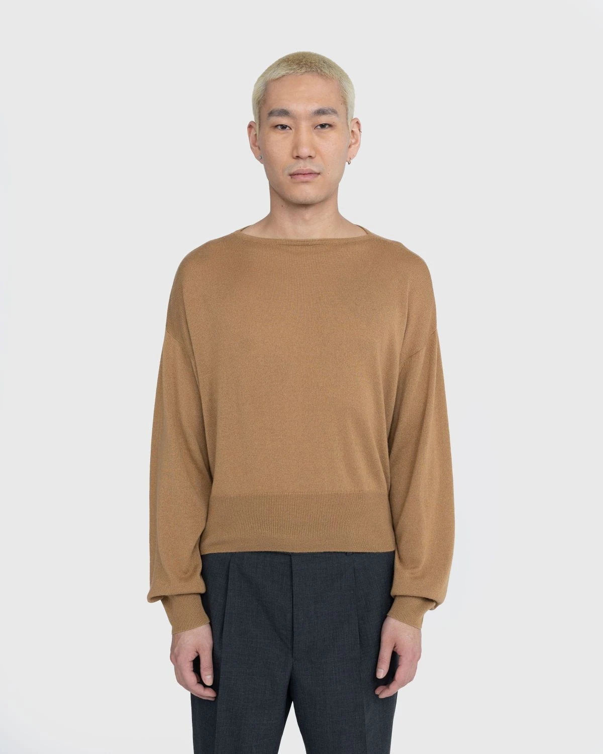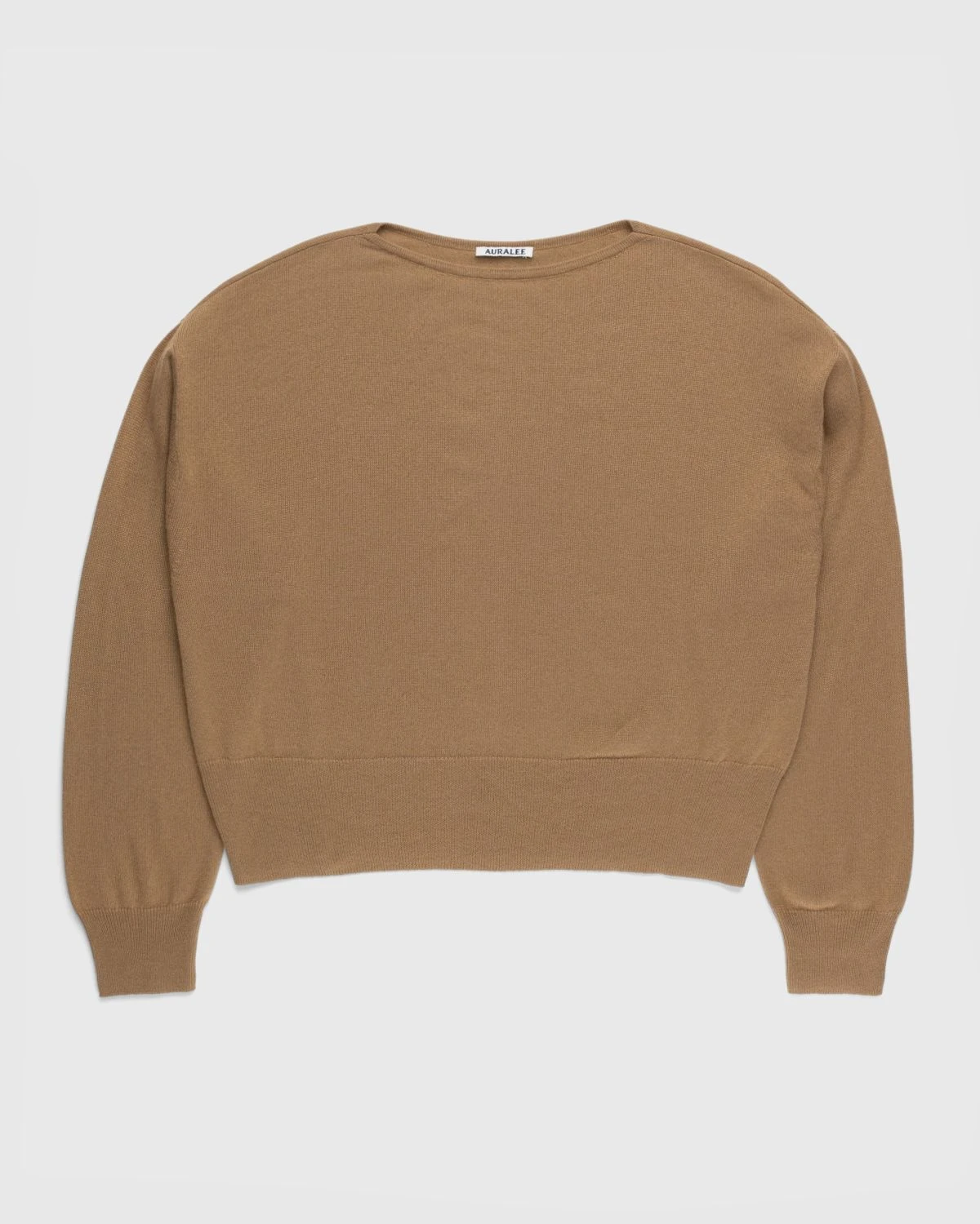 This Auralee knit is crafted from washable silk and cashmere yarn that is characterized by its smooth texture, the luster of the cashmere silk, and the lightness of the raw material. Featuring a boat neck, the cozy pullover is detailed with ribbed trims at the cuffs and hem, while being cut in a relaxed, boxy fit with elongated sleeves.
