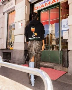 Arriving with a small, co-branded woven label at the chest, the back of this hoodie presents Bar Bassoβs most iconic drink: the Negroni Sbagliato. Invented by owner Maurizio Stocchetto, it is served in a massive scenographic glass, as shown in the graphic print. As part of our celebration of all things Italian for Milan Design Week, weβve paired up with Bar Basso, one of the oldest and most influential cocktail bars in Milan. Over the years, the historical establishment has become closely associated with the cityβs art and fashion scenes, further solidifying it as a true cultural fixture in Milan.