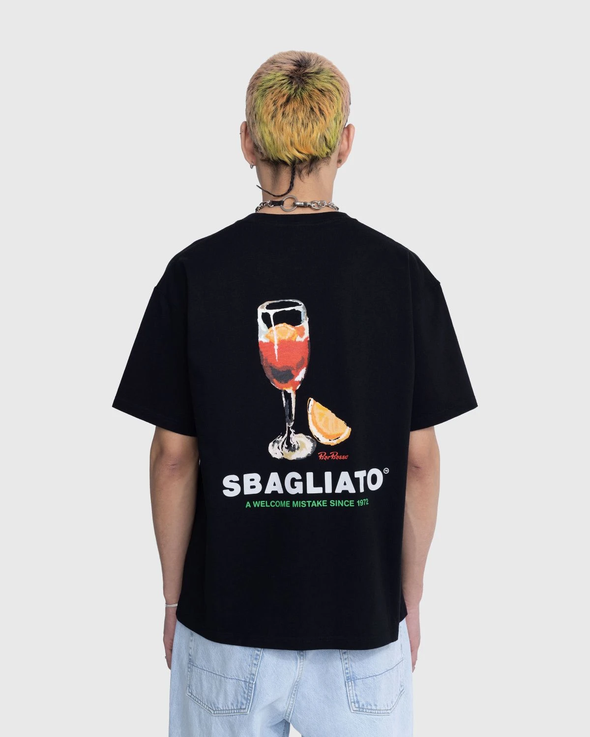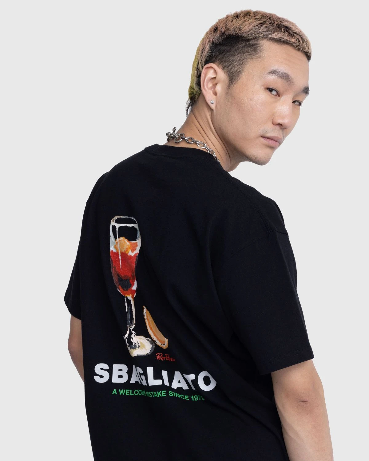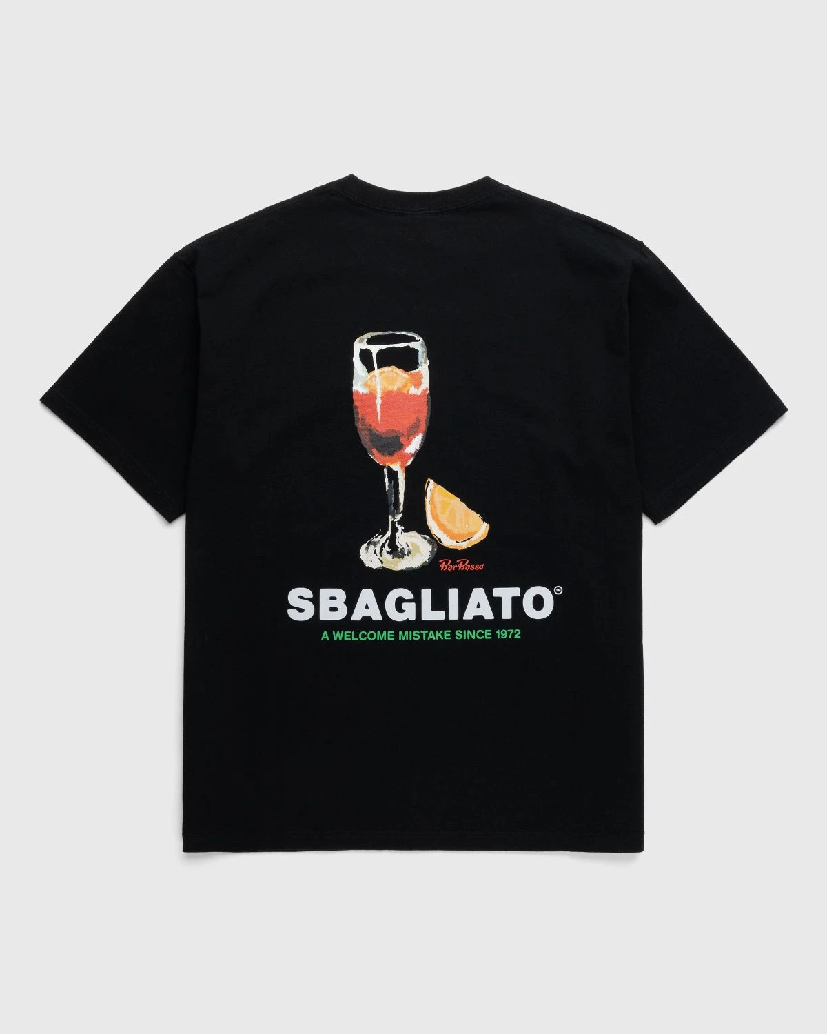 Arriving with a small co-branded, woven label at the chest, the back of this t-shirt presents Bar Basso’s most iconic drink: the Negroni Sbagliato. Invented by owner Maurizio Stocchetto, it is served in a massive scenographic glass, as shown in the graphic print. As part of our celebration of all things Italian for Milan Design Week, we’ve paired up with Bar Basso, one of the oldest and most influential cocktail bars in Milan. Over the years, the historical establishment has become closely associated with the city’s art and fashion scenes, further solidifying it as a true cultural fixture in Milan.