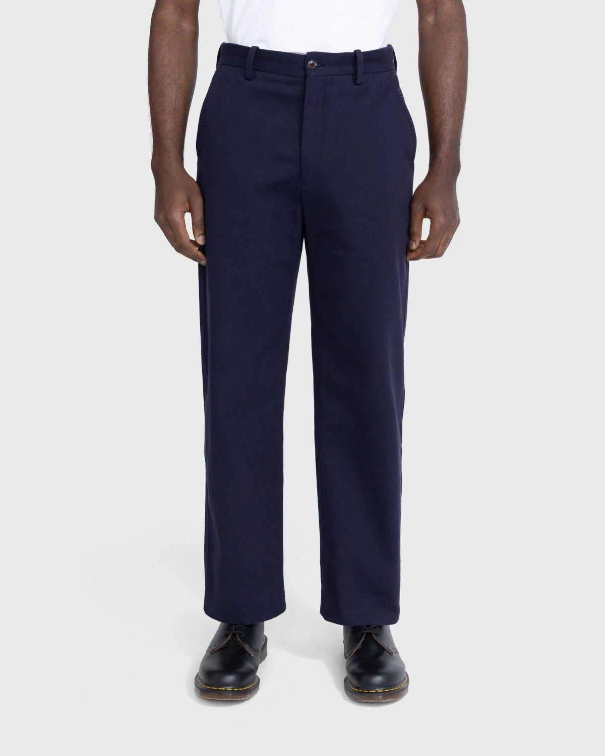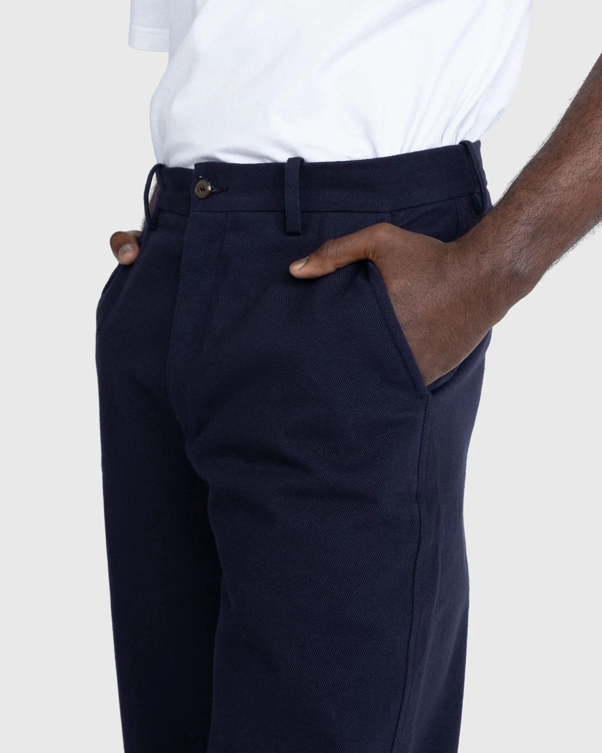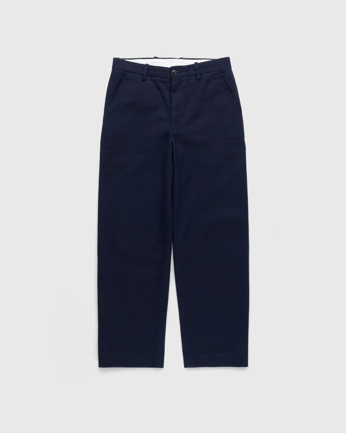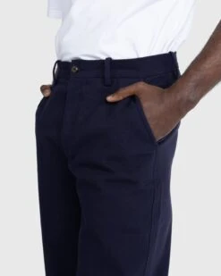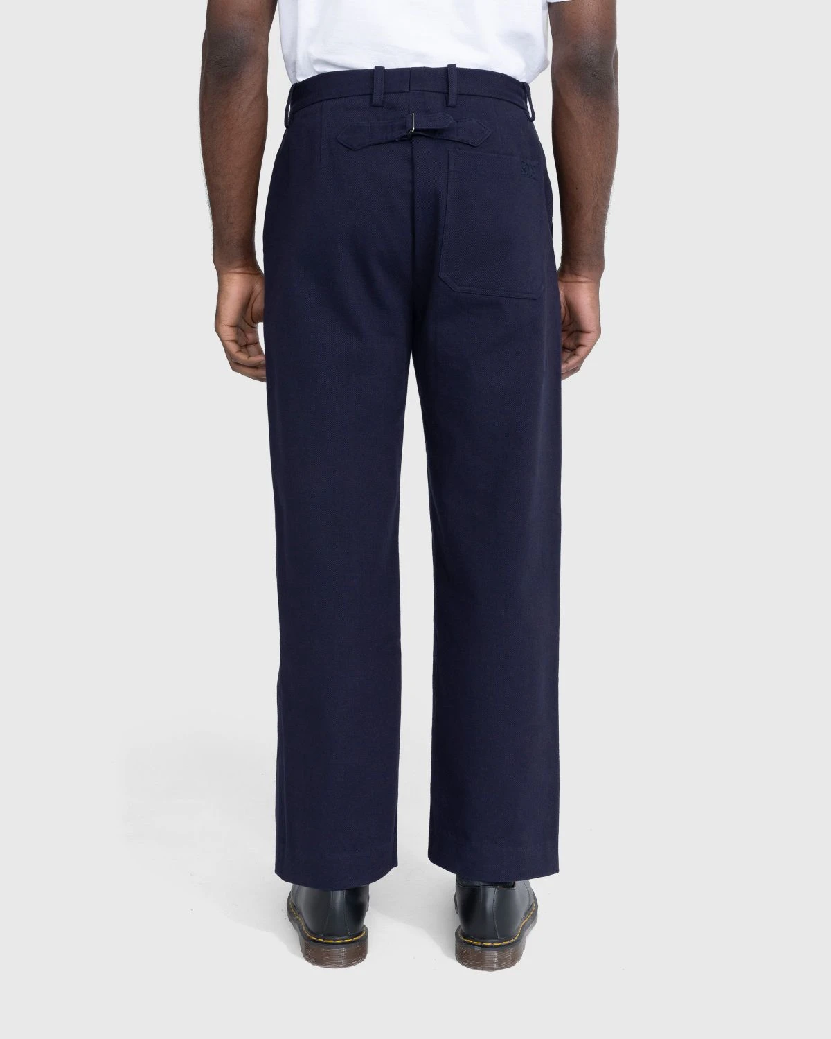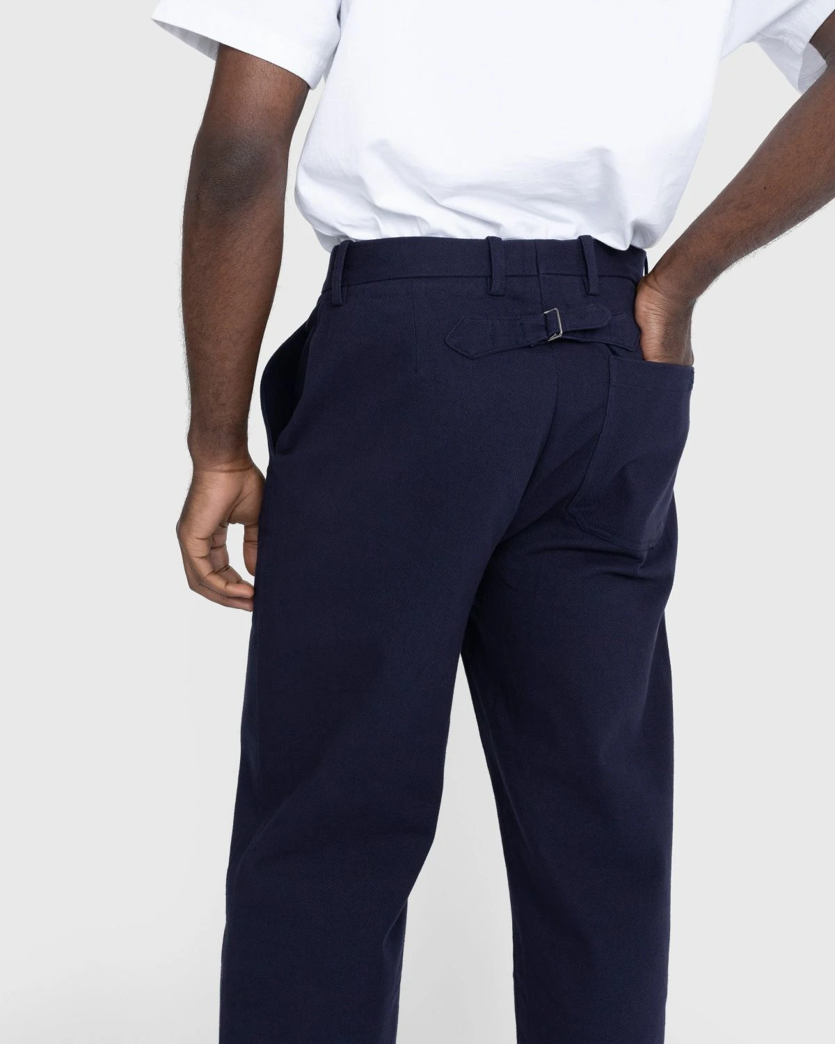 This traditional trouser silhouette, featuring a high rise and a straight leg, is inspired by a pair of French twill workwear bottoms from the 1940s. Produced in cotton, the neutral-colored style is made with classic design elements including button closure and belt loops at the waist, while also incorporating an adjustable back buckle that allows you to achieve the ideal fit. Two pockets are implemented on the front and one on the back to complete the design.