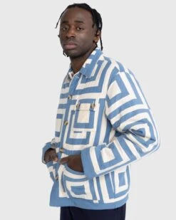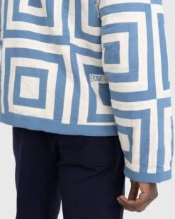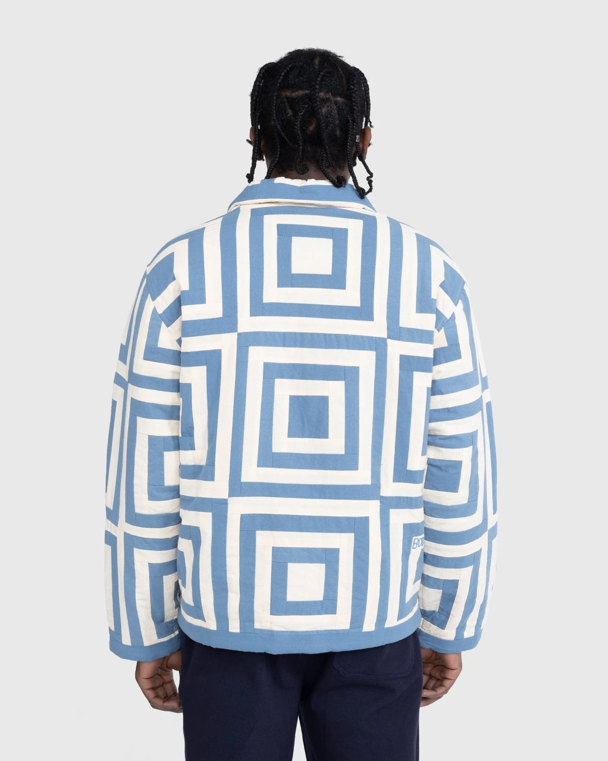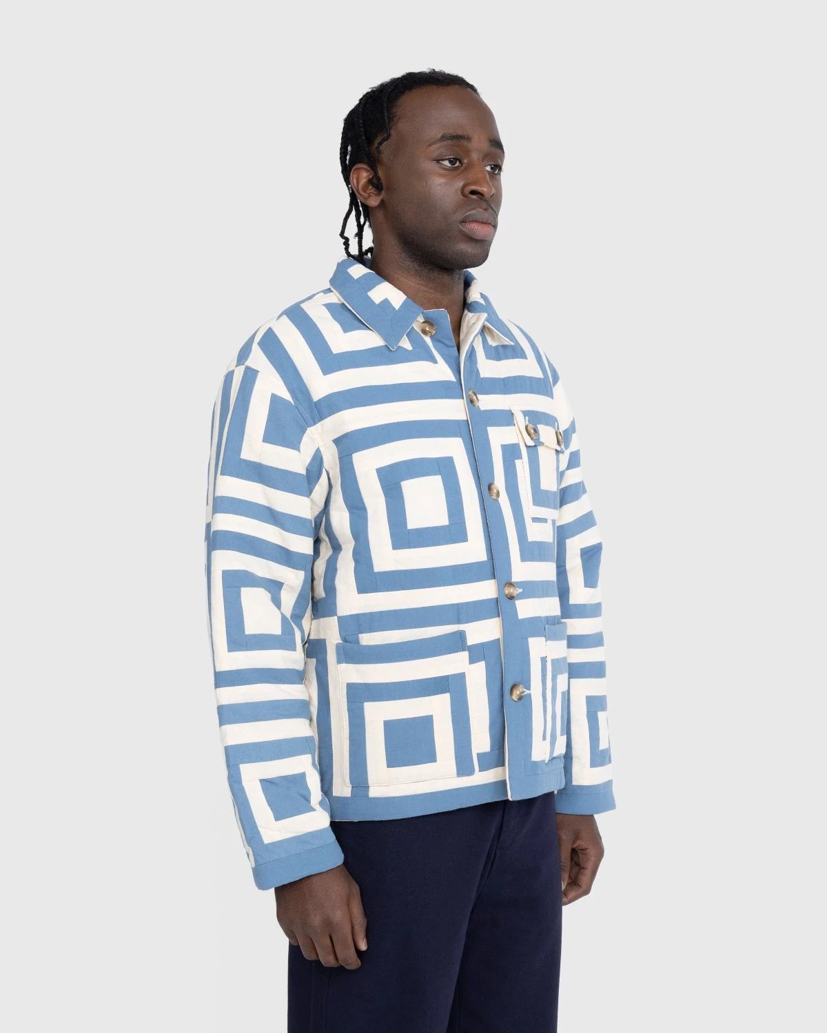 Inspired by a late 19th century quilt, the White House Steps quilt block is a variation of the Log Cabin block, one of the oldest quilt designs found on both sides of the Atlantic. The jacket is fully reversible, featuring a floral calico fabric backing that makes the garment equally captivating on each side. It is made with traditional button closure, a point collar, straight hem, and three pockets incorporated onto the front.