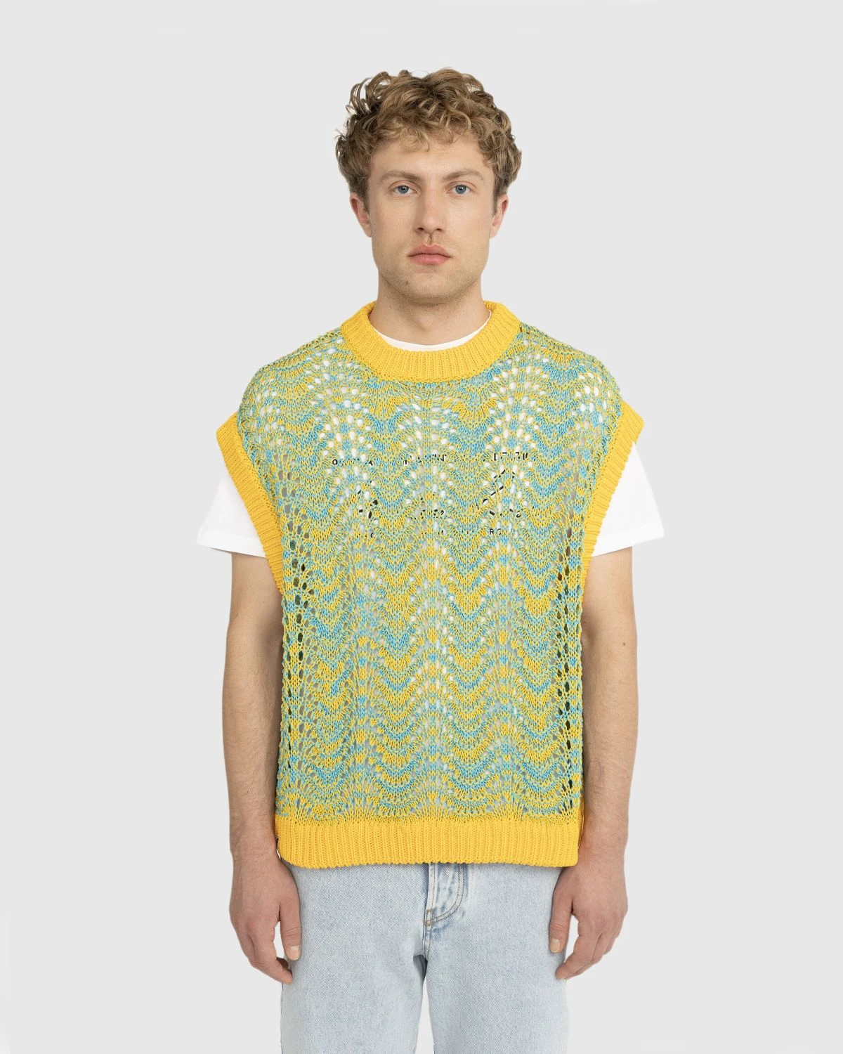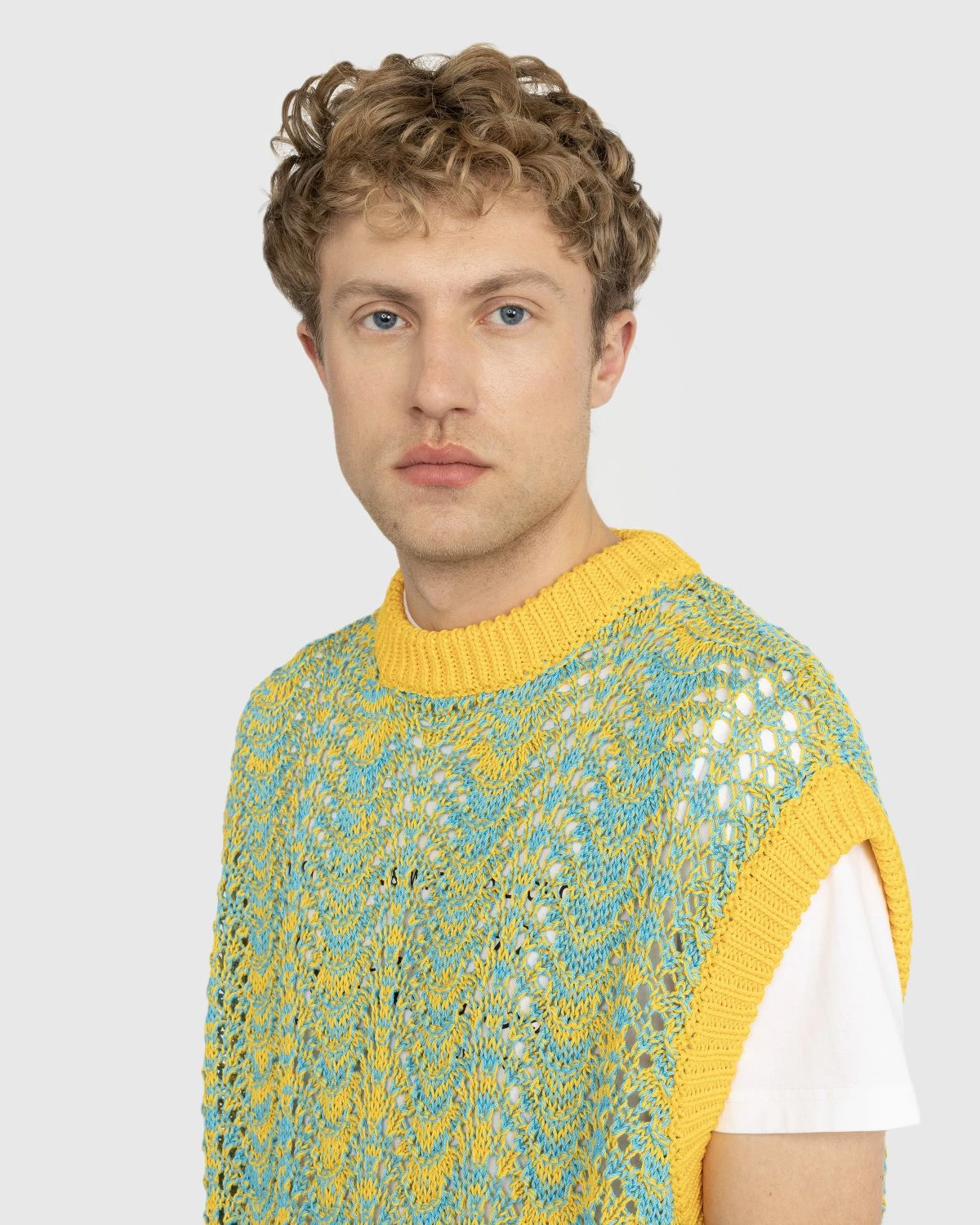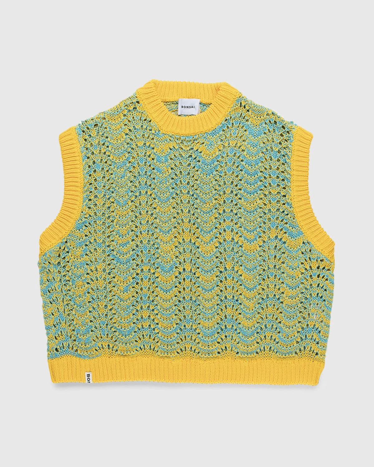 Add a splash of color to your wardrobe with the Knit Gilet by Bonsai. Produced in 100% cotton, the sleeveless garment features intricate crochet knit construction creating a semi see-through look that caters to layering. A fun all-over pattern draws immediate attention to the piece, which is accentuated with chunky ribbed trims at the crew neck, cuffs, and hem. While fitting true to size, the gilet is cut for an oversized fit for a more comfortable wear.