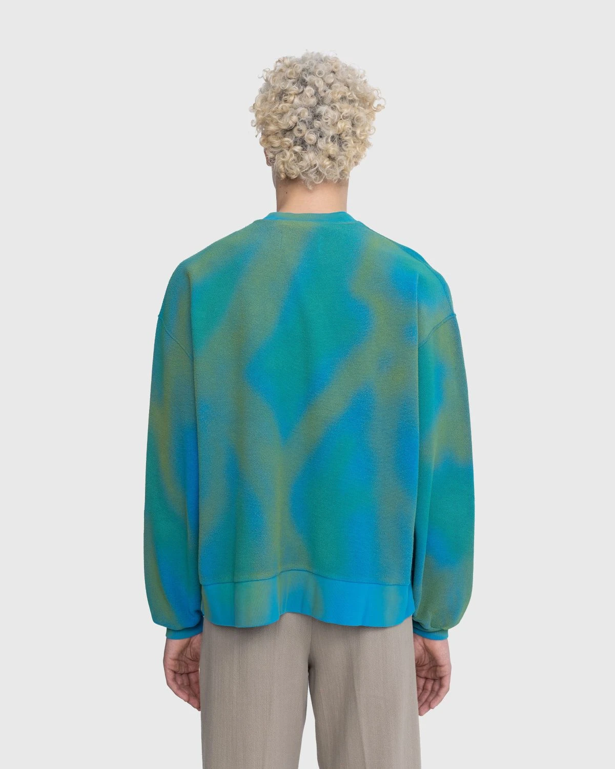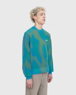 100% cotton. Spray dye effect pattern. Ribbed crew neck, cuffs, and hem. Logo print detail at the left chest.