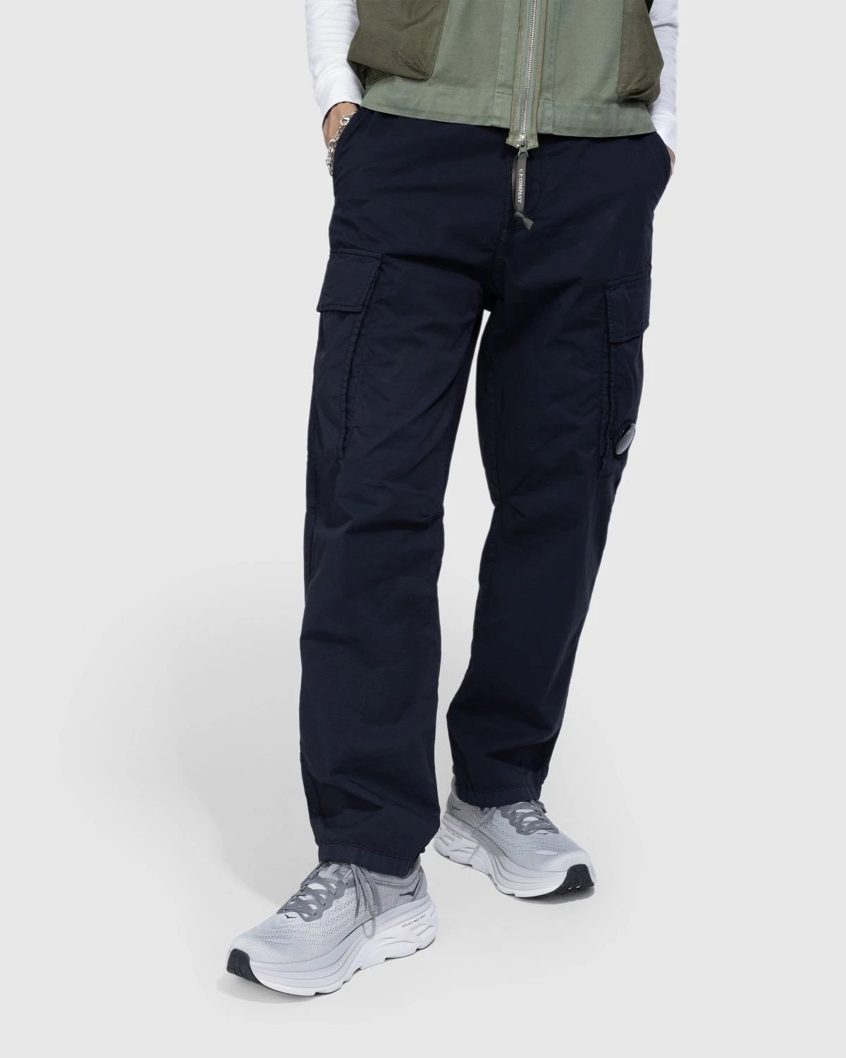 This pair of C.P. Company cargos is cut in a loose fit from a stretchy cotton fabric that is garment-dyed to create increased chromatic depth and intensity throughout. The style features reinforced belt loops, multiple pockets including slanted hand pockets, back flap pockets, and twin cargo pockets, and the brandβs signature lens detail incorporated at the left thigh.