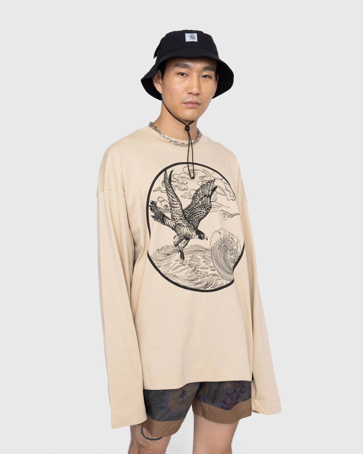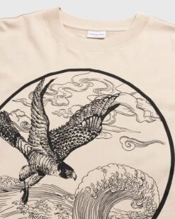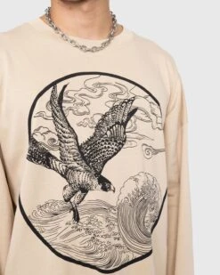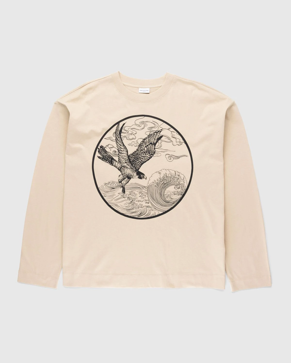 Dries van Noten is here to take your t-shirt collection to the next level with a mature style constructed from soft cotton jersey. The oversized t-shirt is detailed with long sleeves and features a scenic print of a falcon in flight surrounded by hazy clouds and rushing waves. Arriving in a tonal beige hue, the t-shirt is finished with a classic crewneck collar and is sure to add a refined touch to your wardrobe.