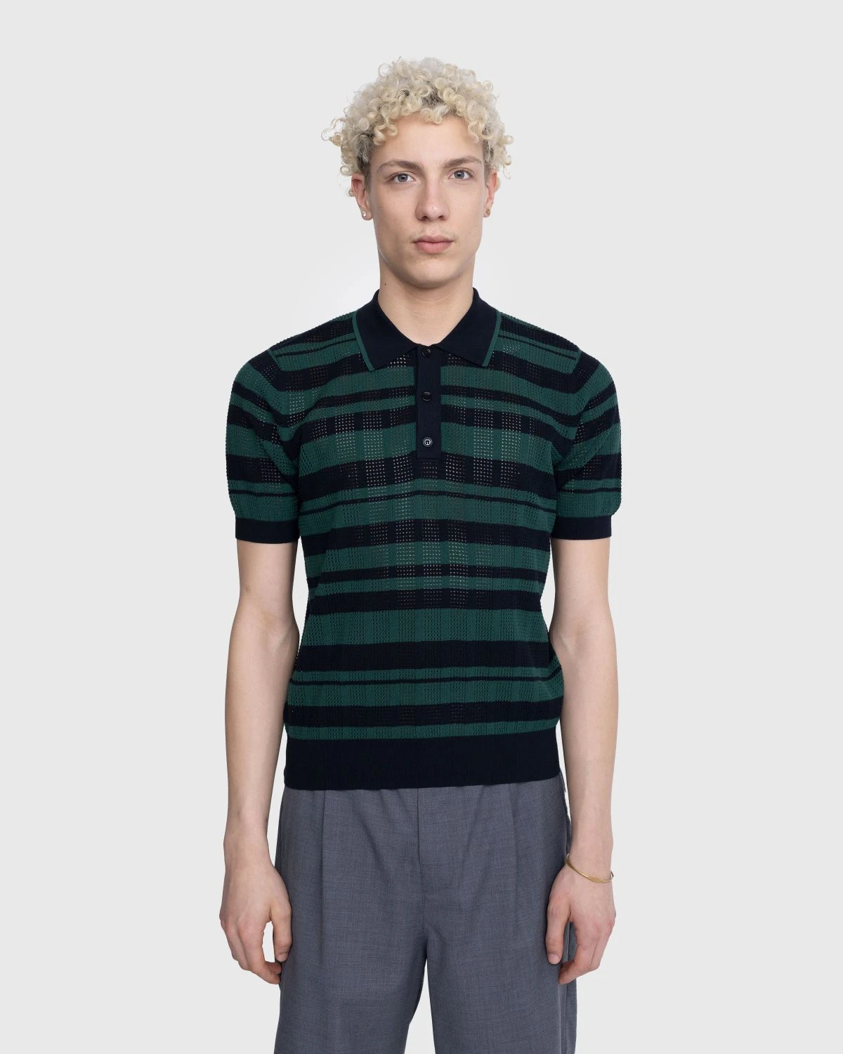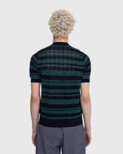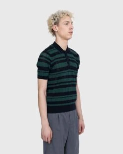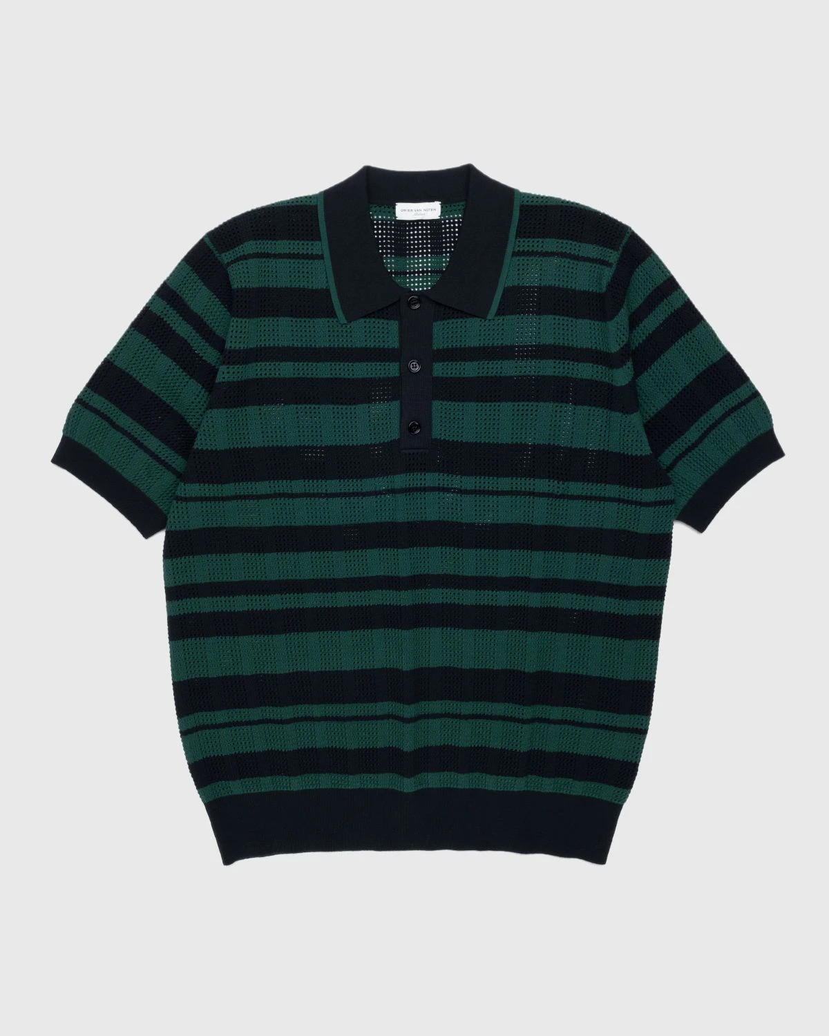 A nod to decades past, the Mirko is Dries van Notenβs elevated take on the knit polo shirt. The mature top is crafted from a polyester-silk blend, featuring open-knit construction that gives the garment a semi see-through appearance. An all-over striped pattern brings added dimension to the style, which is detailed with contrasting trim at the collar. To ensure a traditional look, the polo is cut for a slim, form-fitting wear.