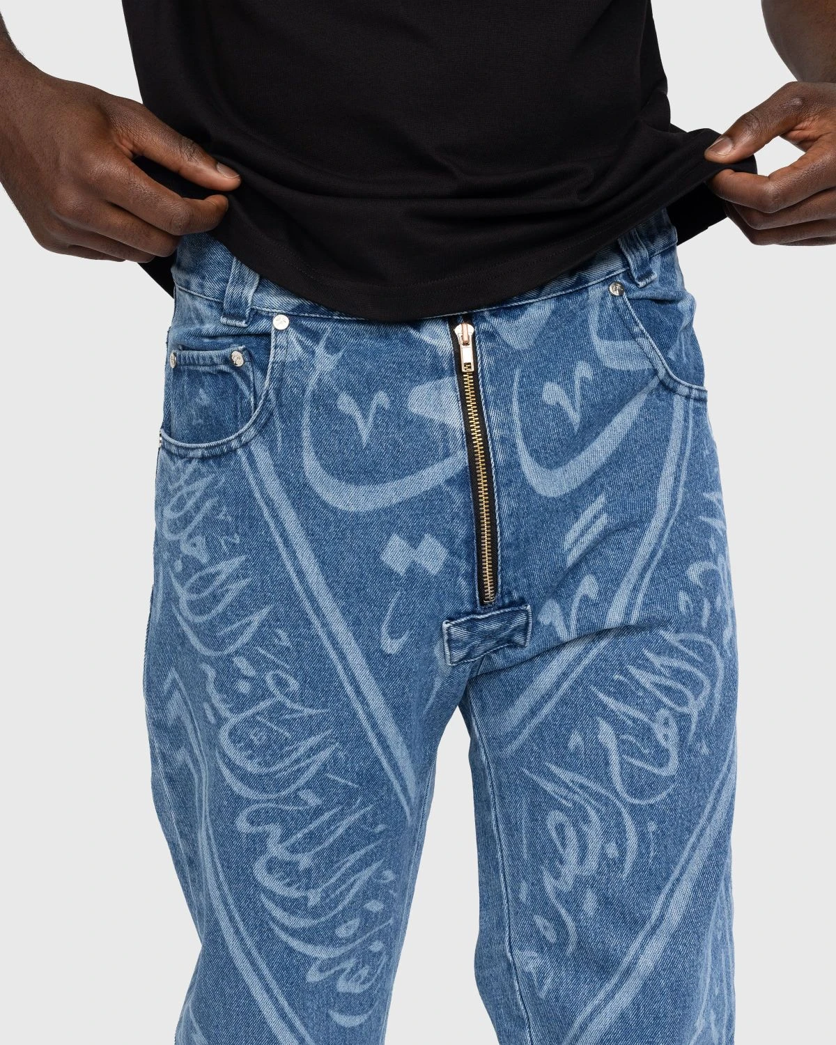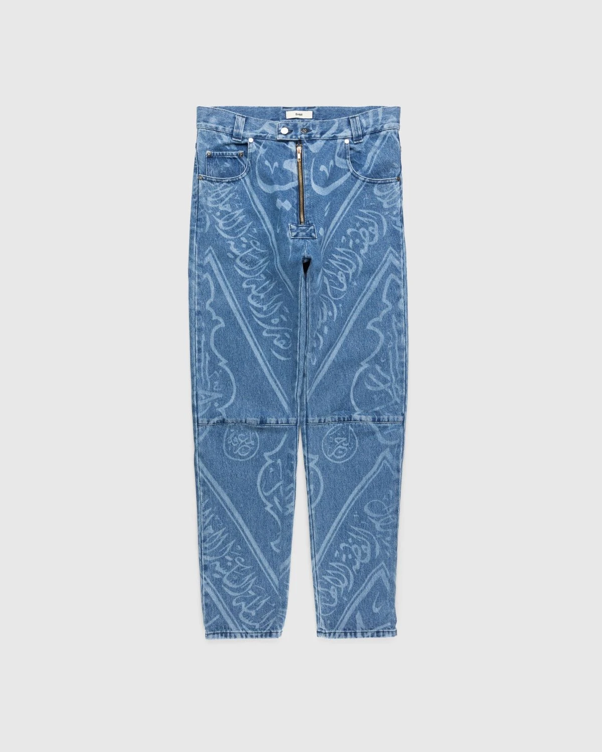 This season, GmbH elevates the classic denim pant. The Fatin style arrives in an indigo wash with laser print detailing implemented throughout. Unisex, the pair is cut for a regular fit with a high waist and a straight leg, featuring the brandβs single zip at the front. A leather logo patch is then applied to the back of the waist to brand the silhouette.