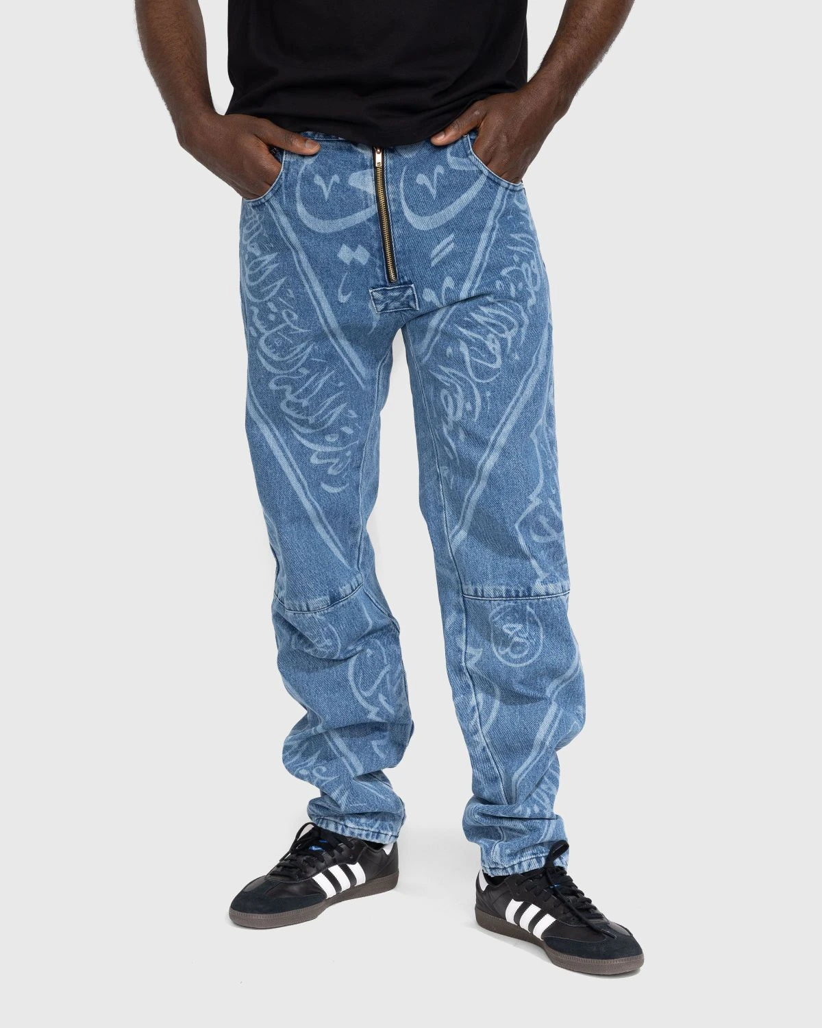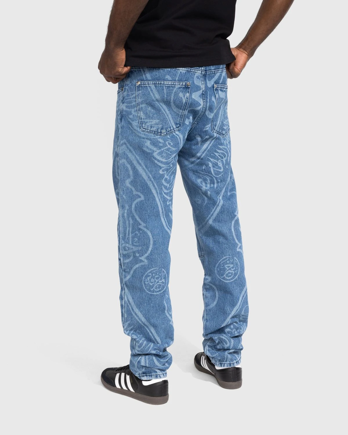 100% organic cotton. Laser print detail. Five-pocket construction. Tonal embossed hardware and buttons. Button fastening. Single zipper at the front. Belt loops. Logo patch at the back waist. Unisex.