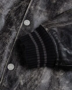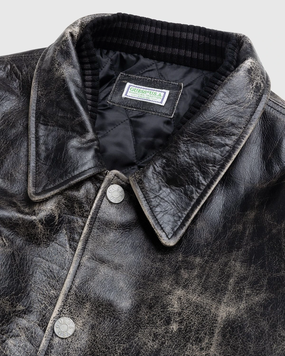 Guess blends elements from traditional leather and varsity jackets to create the Leather Letterman Jacket. The regular-fitting garment showcases distinctive hand fading and distressing throughout, while being subtly branded with custom snap buttons and an 81 motif on the right sleeve as a nod to the brandβs founding in 1981. Additional details include ribbed trims at the inner collar, cuffs, and hem, as well as front pockets.