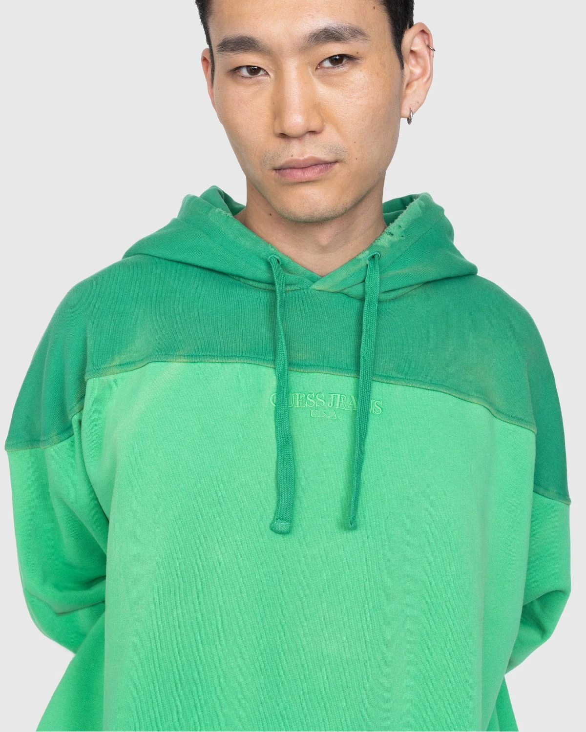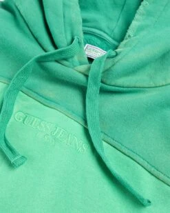 Guessβ Two-Tone Hoodie arrives this season in a vibrant green colorway for adding a pop of color to your outfits. Crafted from 100% cotton, the cozy pullover style features hand fading/distressing for a more distinctive look. Traditional hoodie design elements include an adjustable drawstring hood and rib knit trims, as the garment is subtly branded with tonal Guess iconography at the chest.