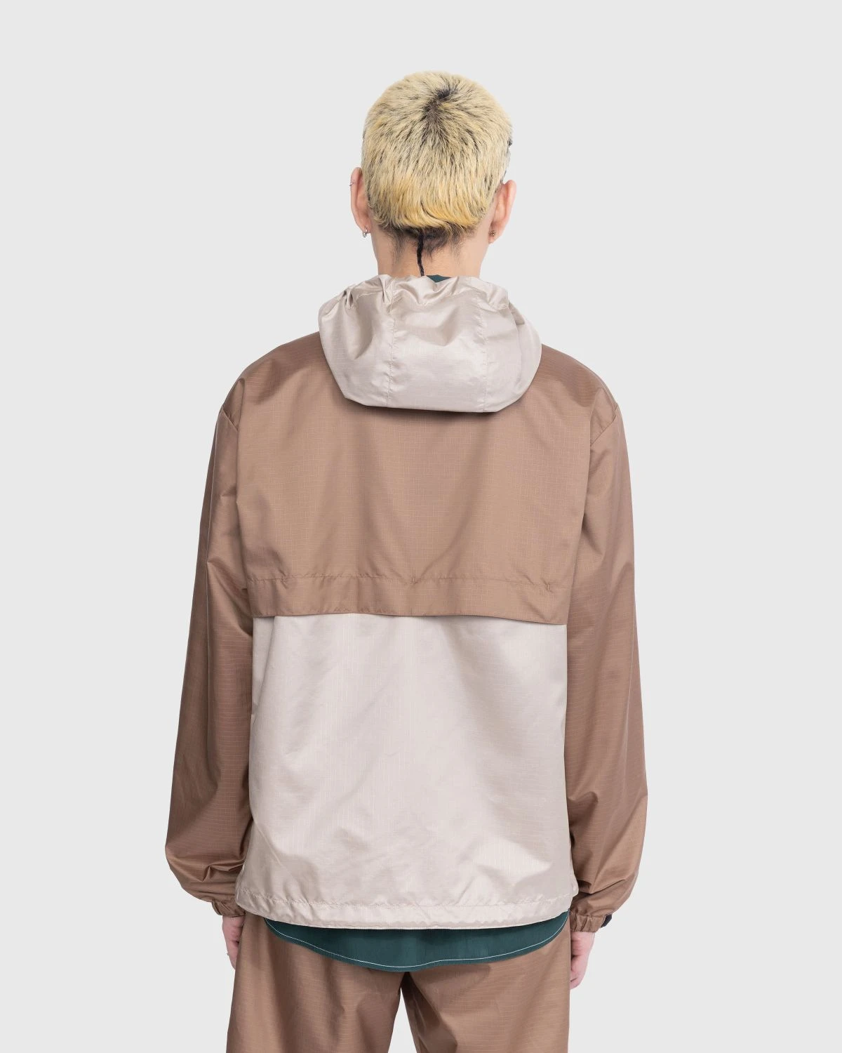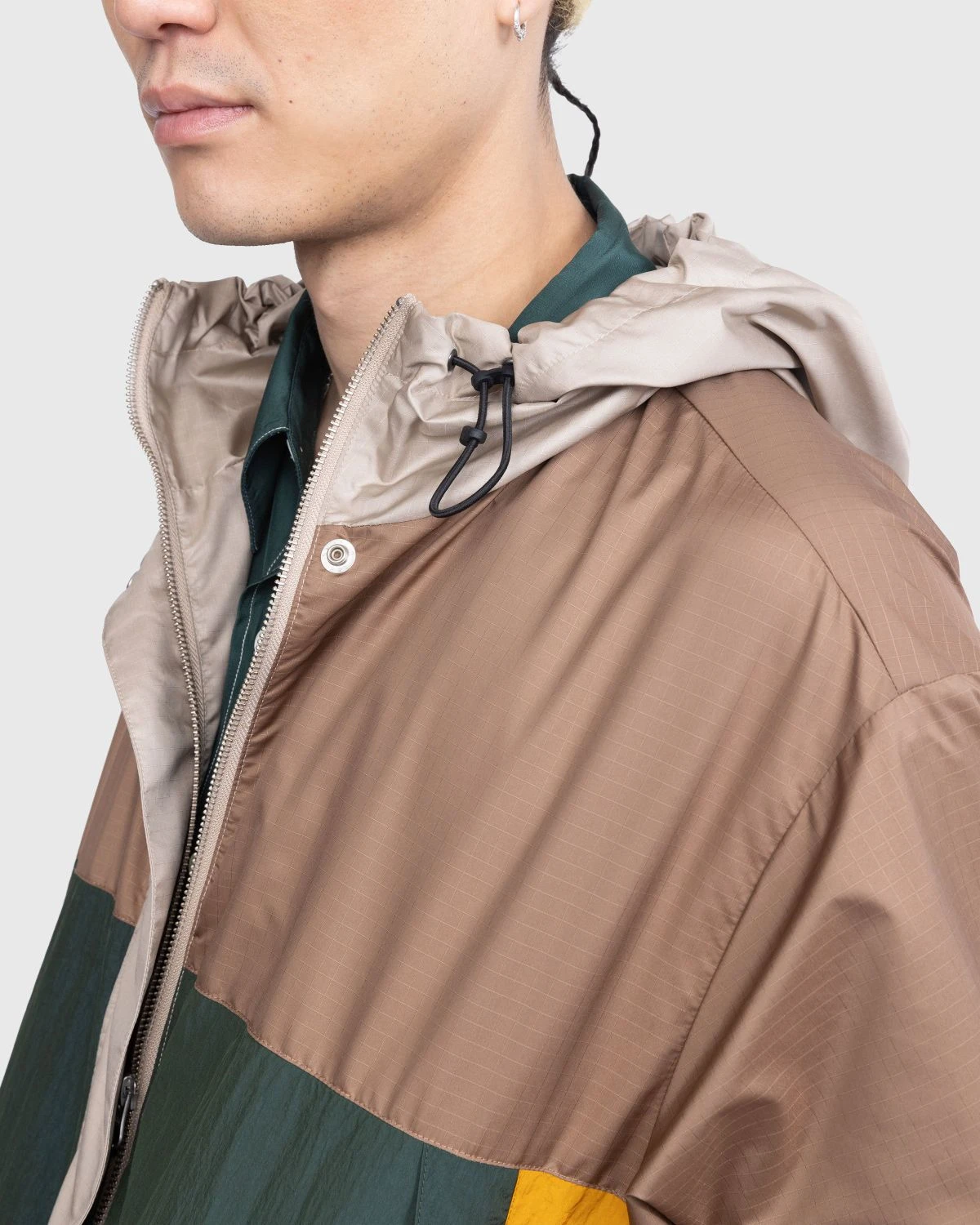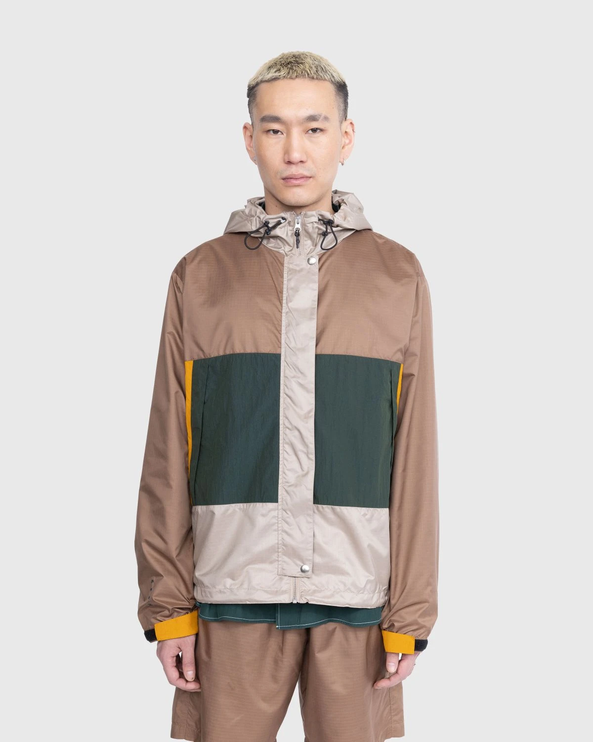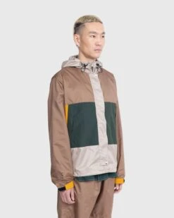 This color-blocked parka combines different textures and colors through its panels made of either ripstop or crinkle nylon. Drawing from vintage technical outdoor-wear, the jacket includes two zipped side pockets in a style typical of mountaineering jackets. To adjust the fit, there are toggles on the hood and at the bottom of the jacket. Further details include a mesh lining, a storm flap on the front zipper, and embroidered branding on the sleeve. There is also a matching pair of shorts available from Highsnobiety.