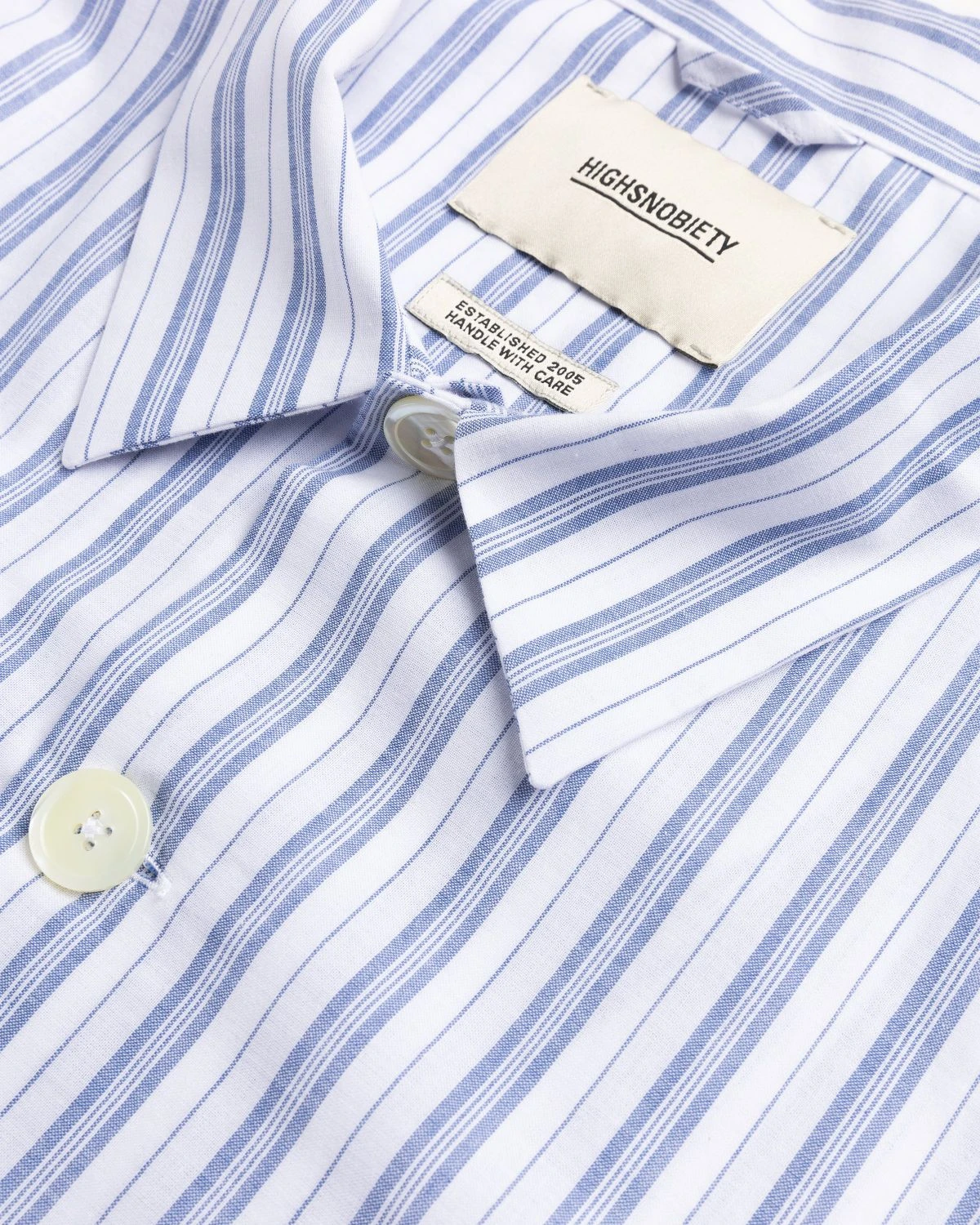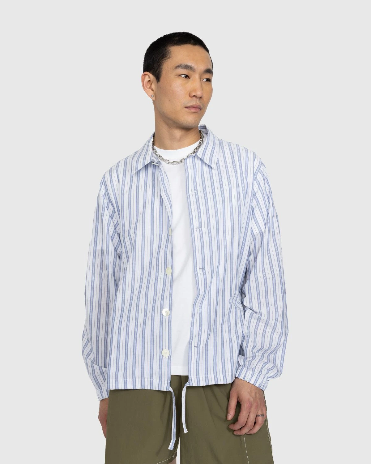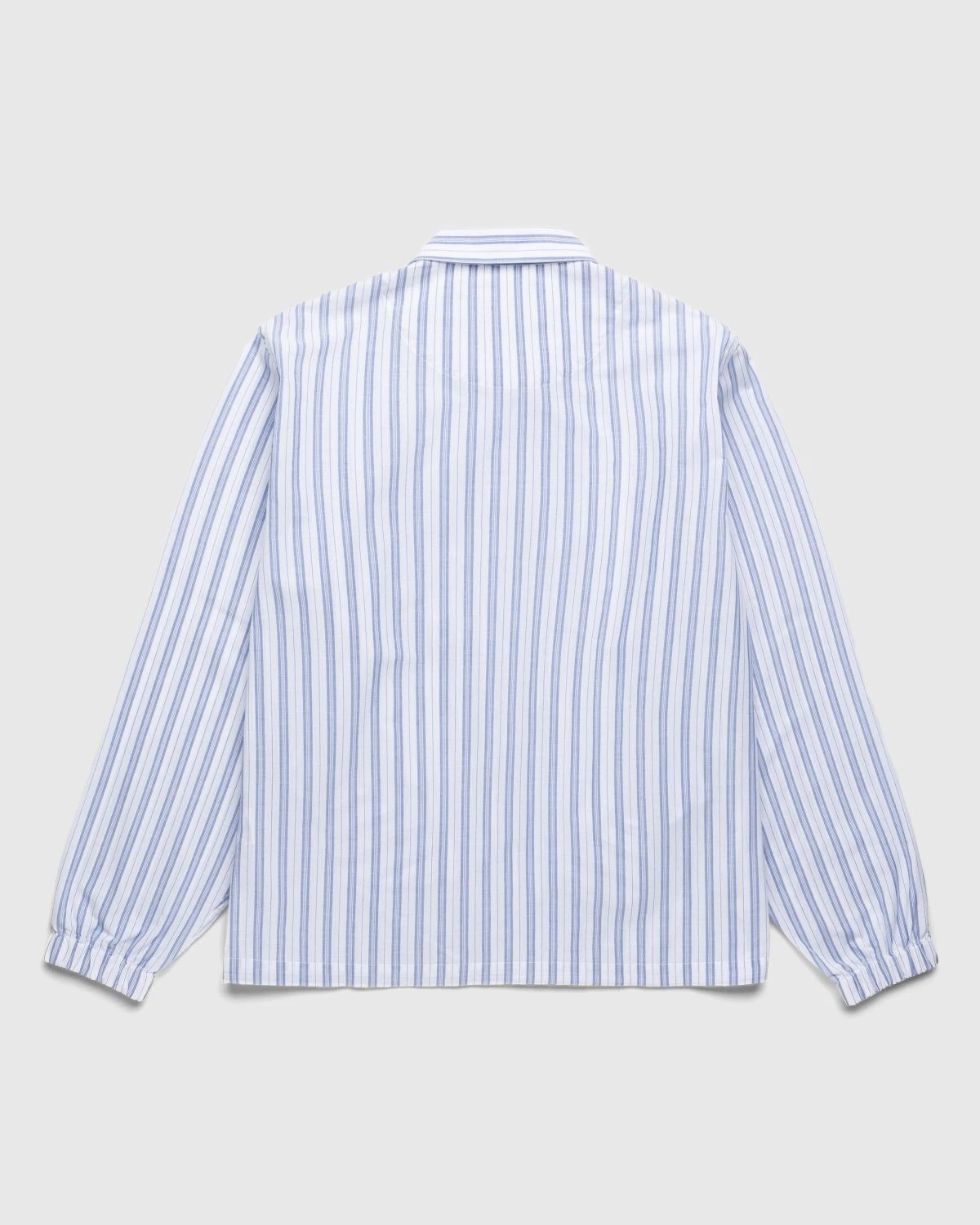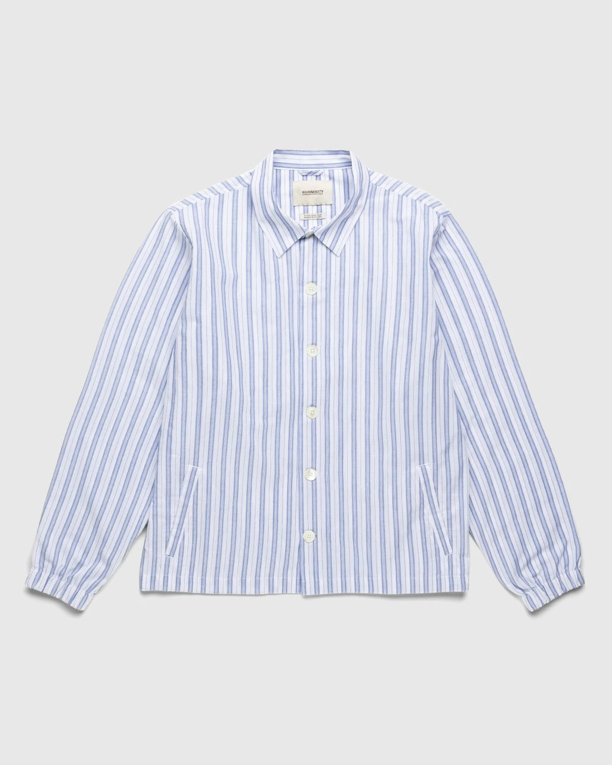 Crafted from lightweight shirting fabric, this coach jacket is outerwear for warm weather. With a striped pattern featured all over, the shirt jacket includes generously-sized side seam pockets and oversized buttons. On the bottom of the shirt, a drawstring allows you to modify the fit while elasticated cuffs can be found at the bottom of the sleeves. Branding on this shirt is minimal, found only through a small flag label on the left side.