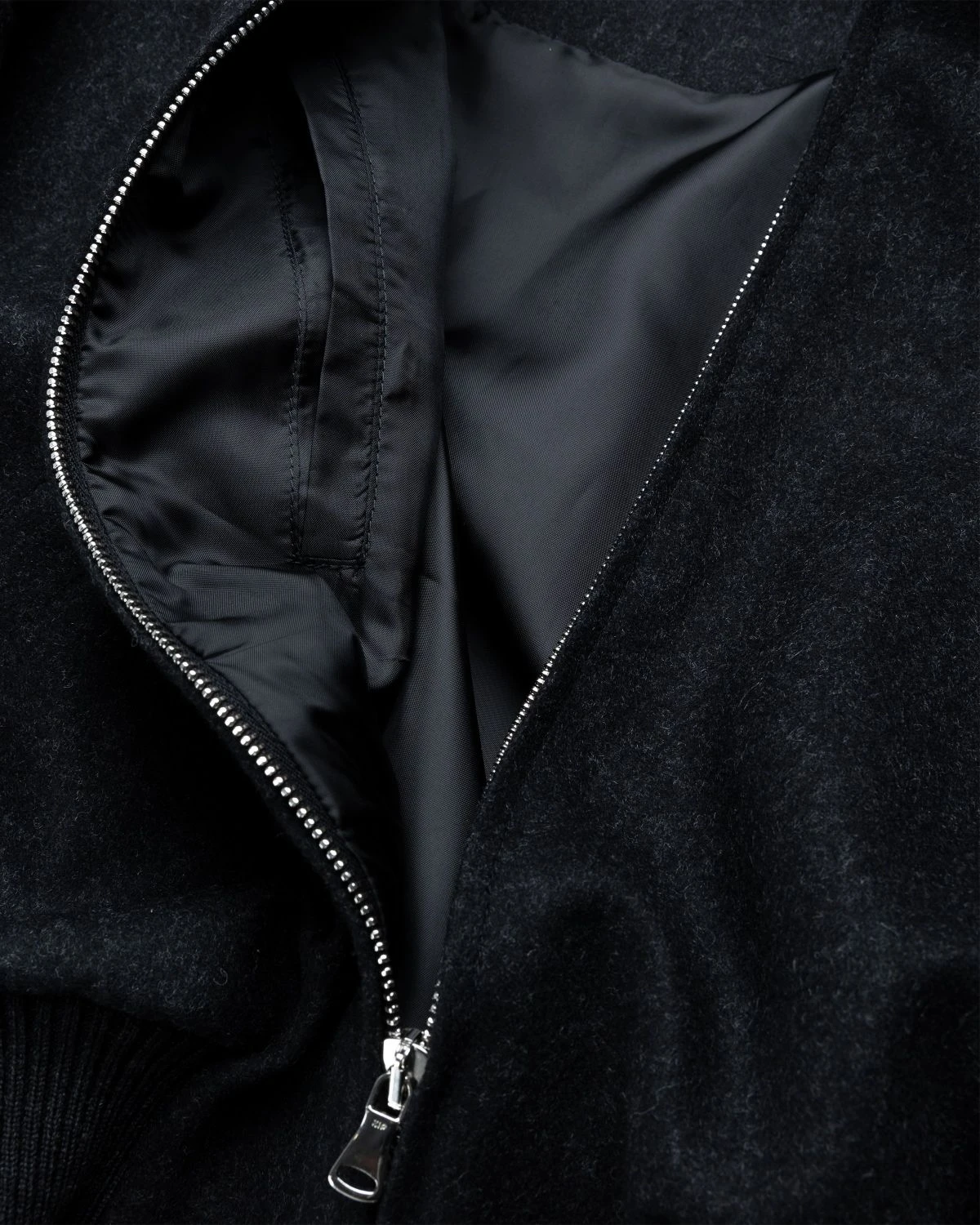 Main materials are 70% wool, 25% nylon, and 5% other fibers. Secondary materials are 86% nylon and 14% elastane. Tone-on-tone decorative topstitching. Bomber-style collar. Metal zip fastening. Ribbed collar, cuffs, and hem. Two side pockets.