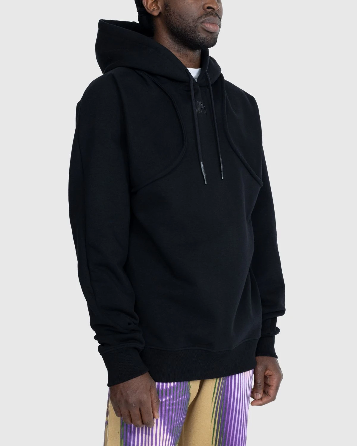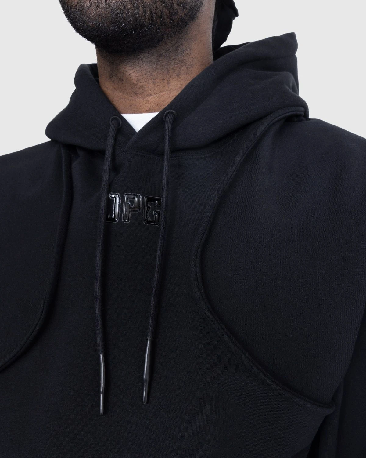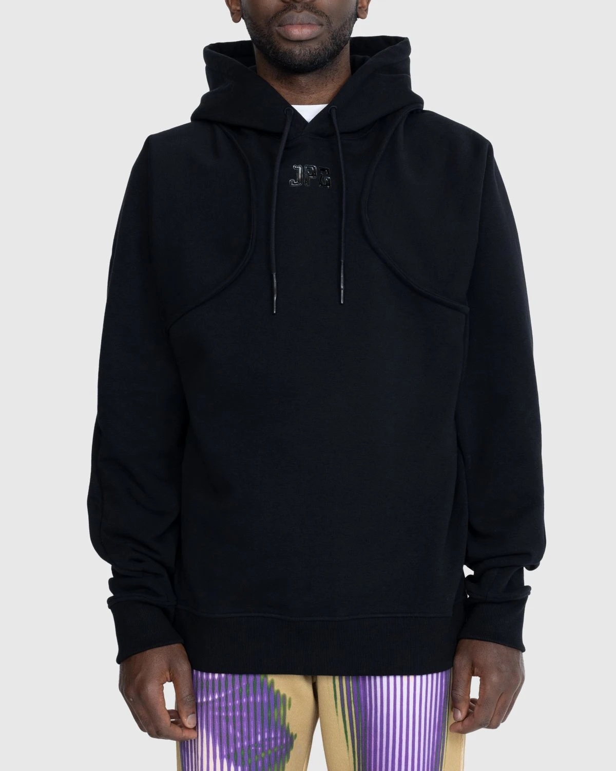 94% cotton. 6% elastane. Brushed fleece interior. Drawstring hood. Ribbed cuffs and hem. Heat-soldered JPG logo at the front.