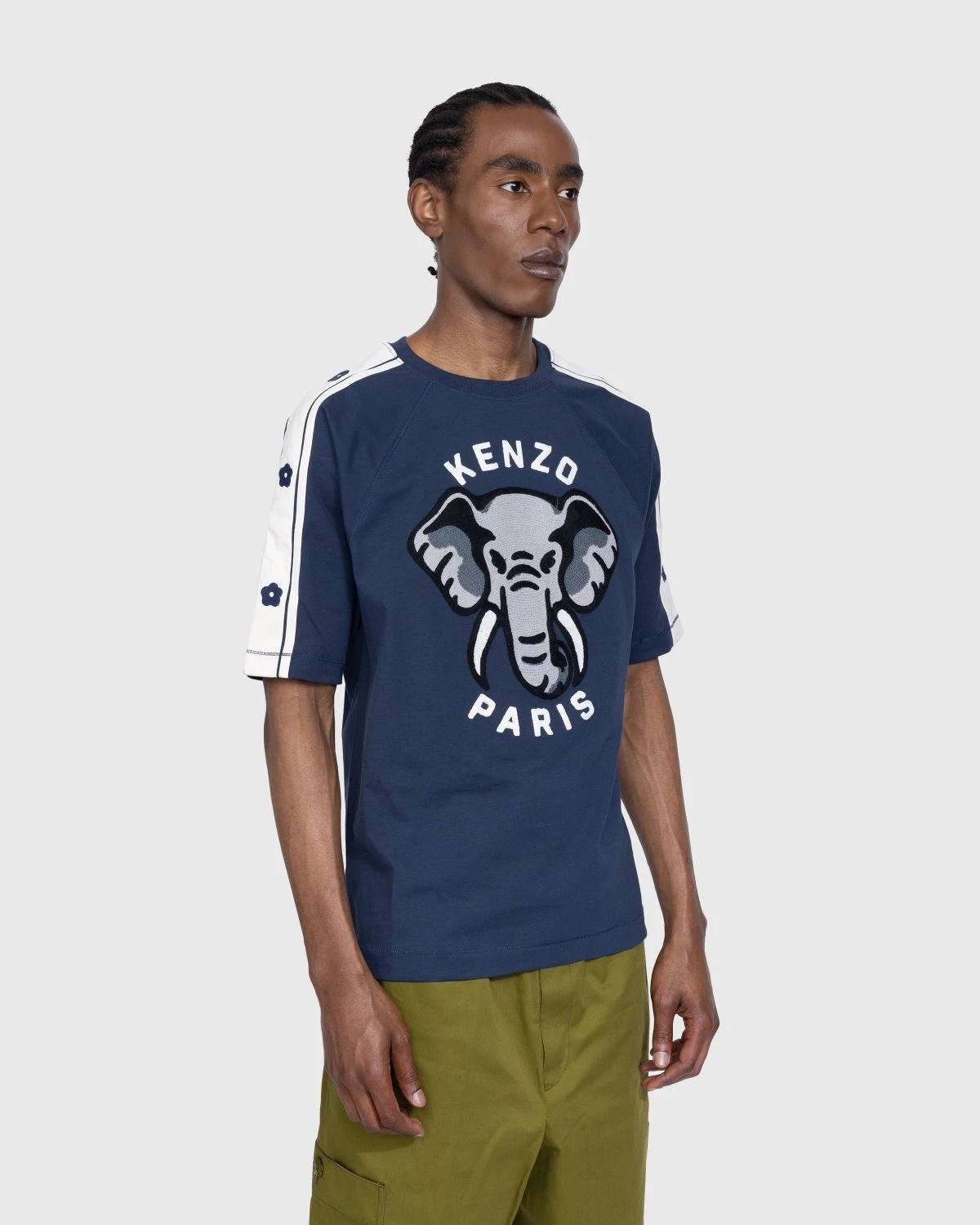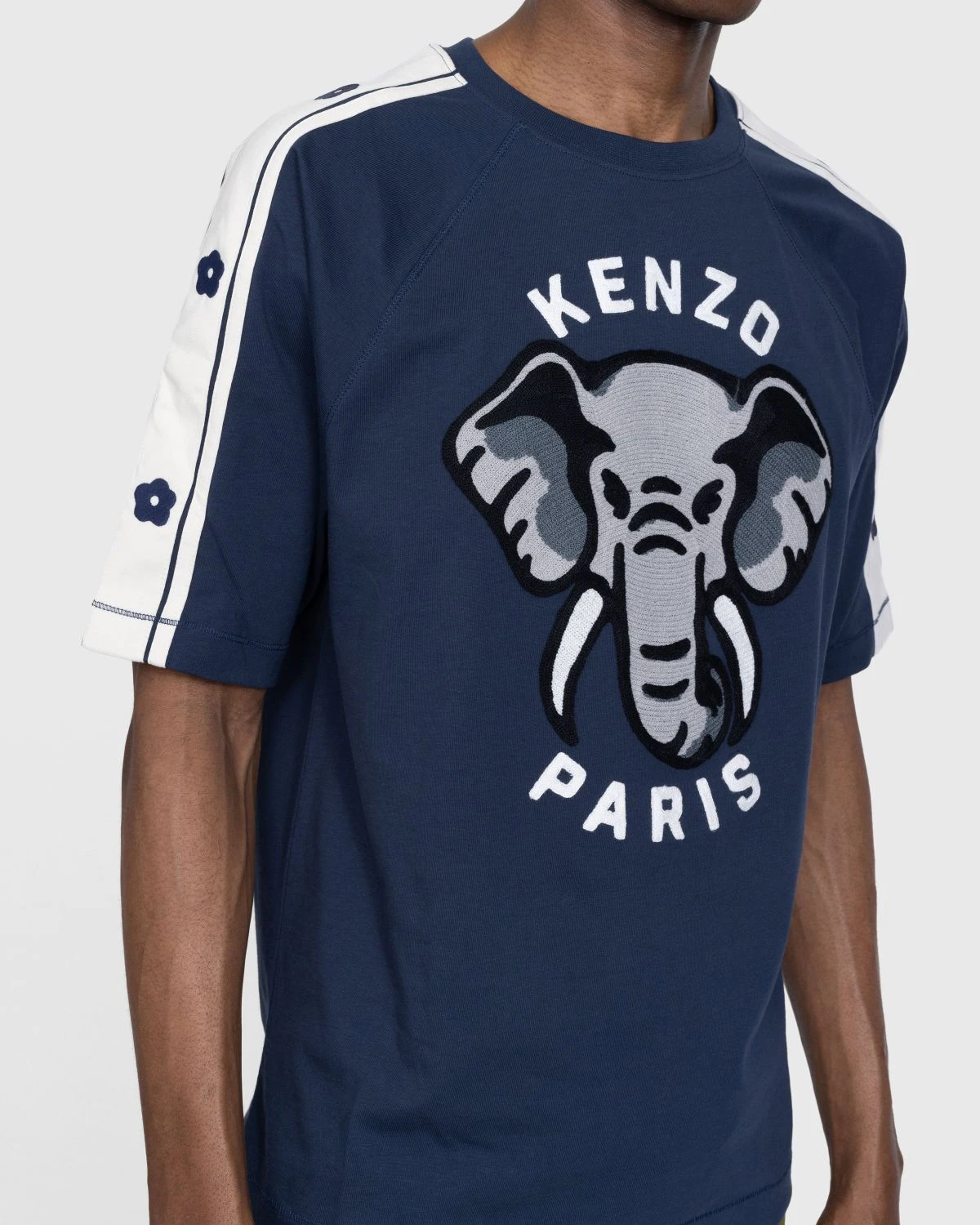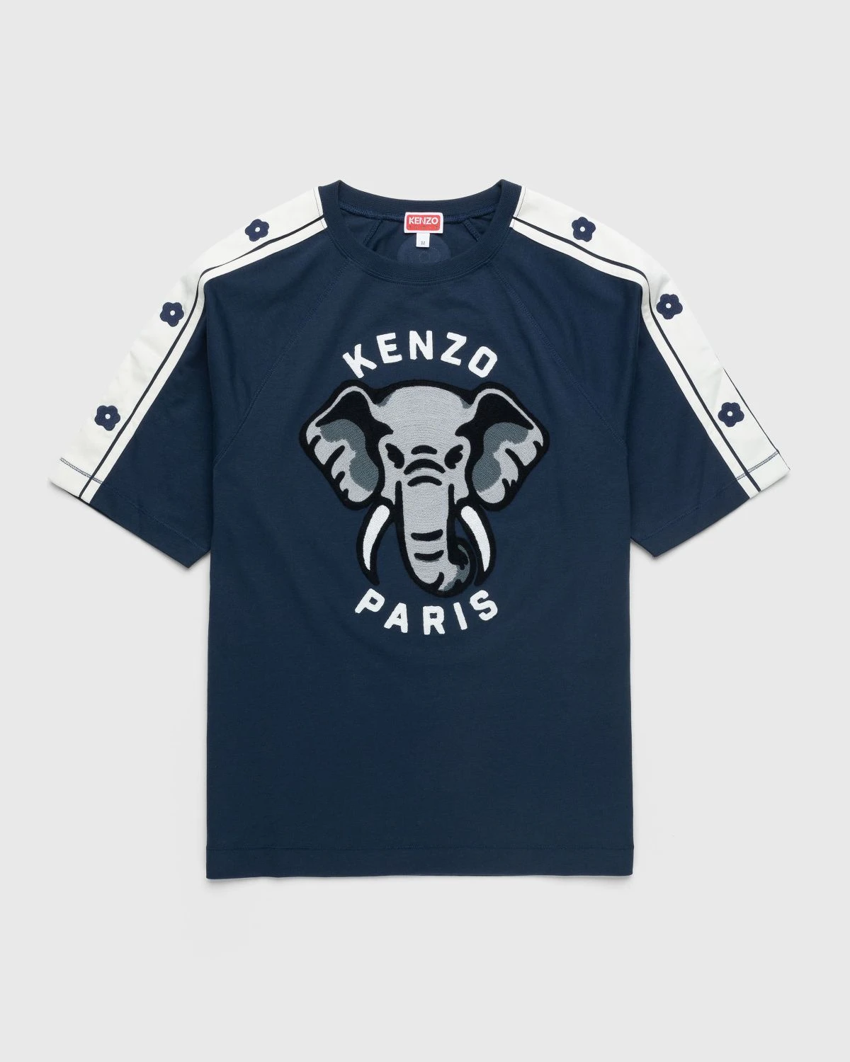 100% cotton. Short raglan sleeves with contrasting side bands. KENZO elephant and KENZO Paris logo at the front in chain stitch embroidery. Boke Flower 2.0 pattern at the sleeves and nape of the neck.