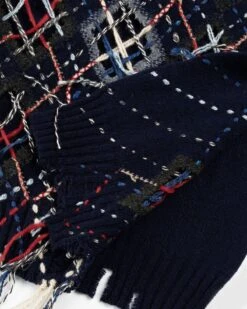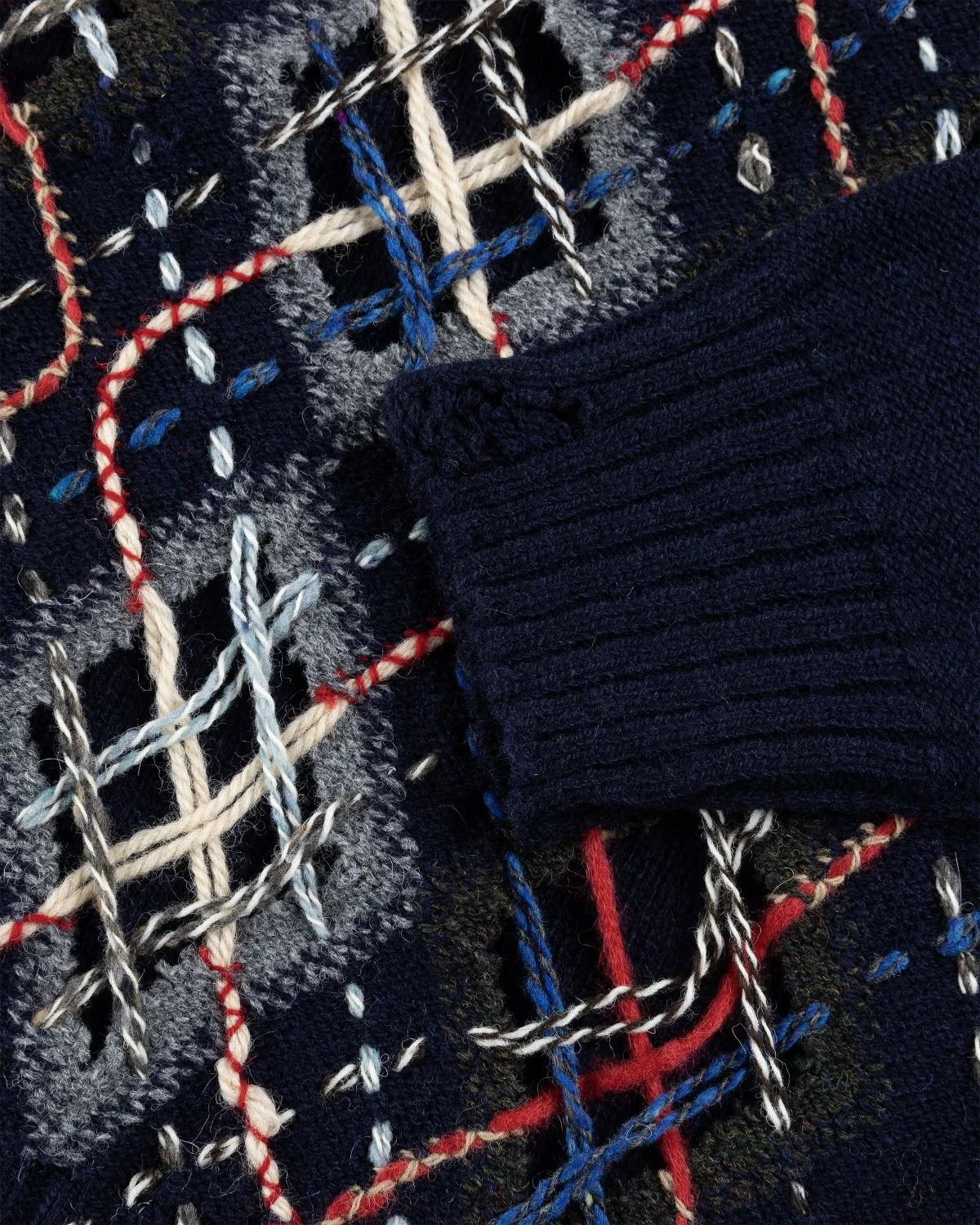 85% wool. 7% alpaca. 6% acrylic. 2% nylon. Argyle intarsia knit. Contrasting stitches. Ribbed crew neck, cuffs, and hem. Side slits. Straight hem. Four stitches moniker at the back.
