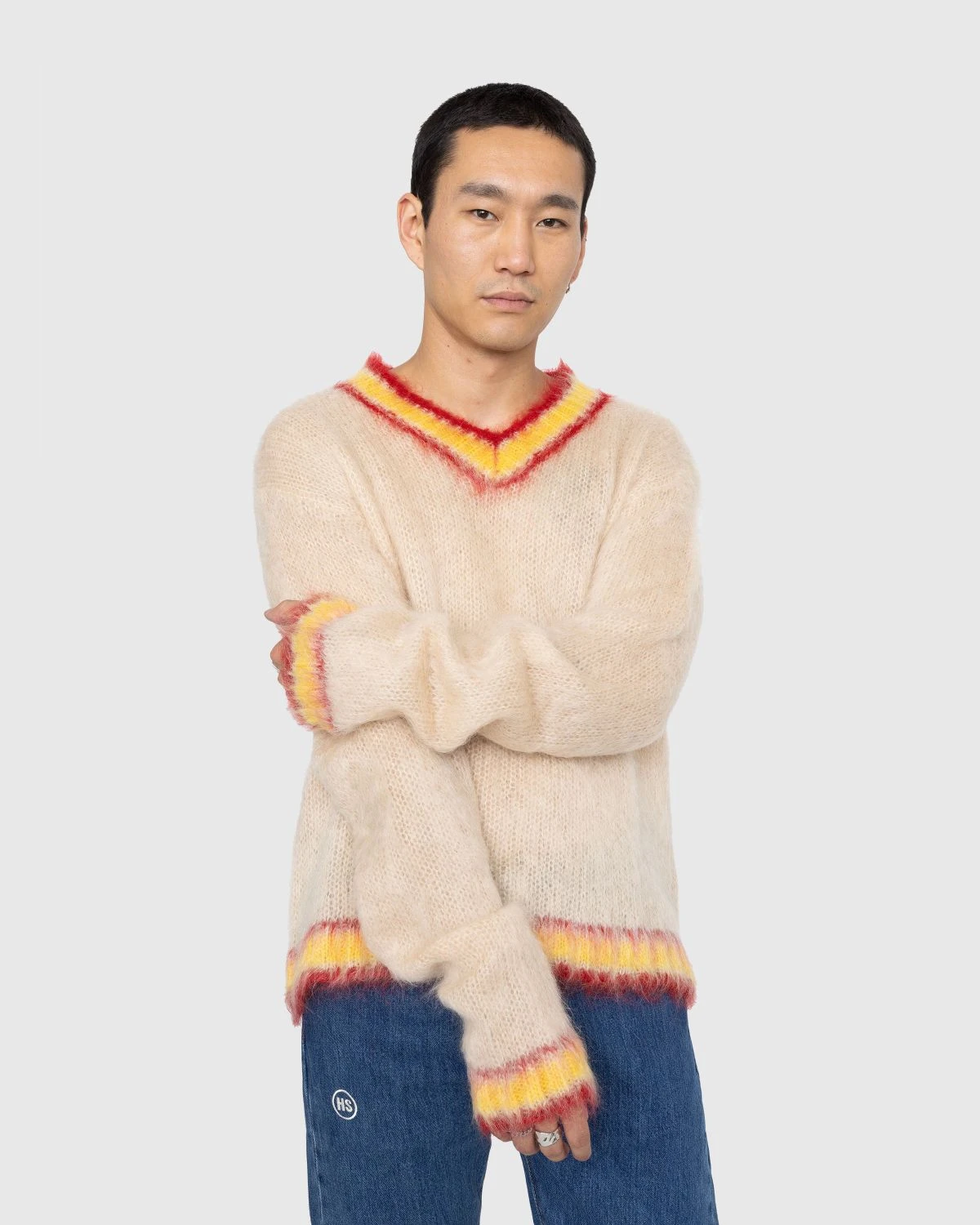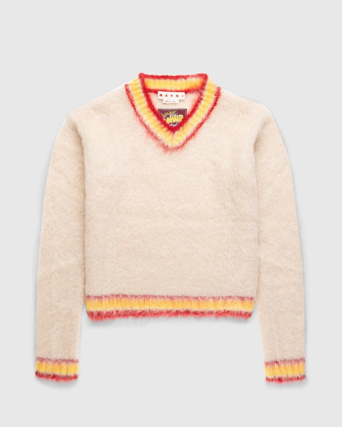 Marniβs Mohair Sweater is sure to bring cozy vibes to your wardrobe this season and beyond. Predominantly produced in brushed mohair, the knit top is cut in a regular fit for increased comfort and is detailed with a striped pattern at the cuff, hem, and v-neck collar.
