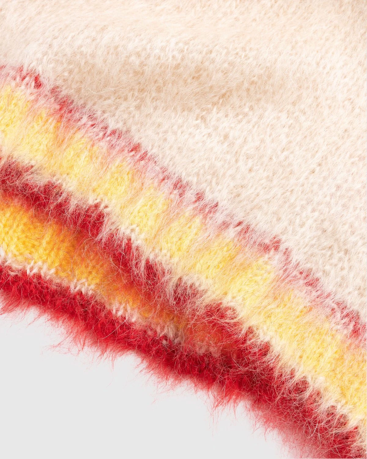 Primary fabric: 80% Mohair Knit, 20% Polyamide Woven. Secondary fabric: 38% Acetate Knit 32%, Polyamide Knit, and 30% Mohair Knit. Brushed. V-neck collar. Striped rib-knit neck, cuffs, and hem.