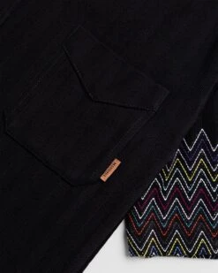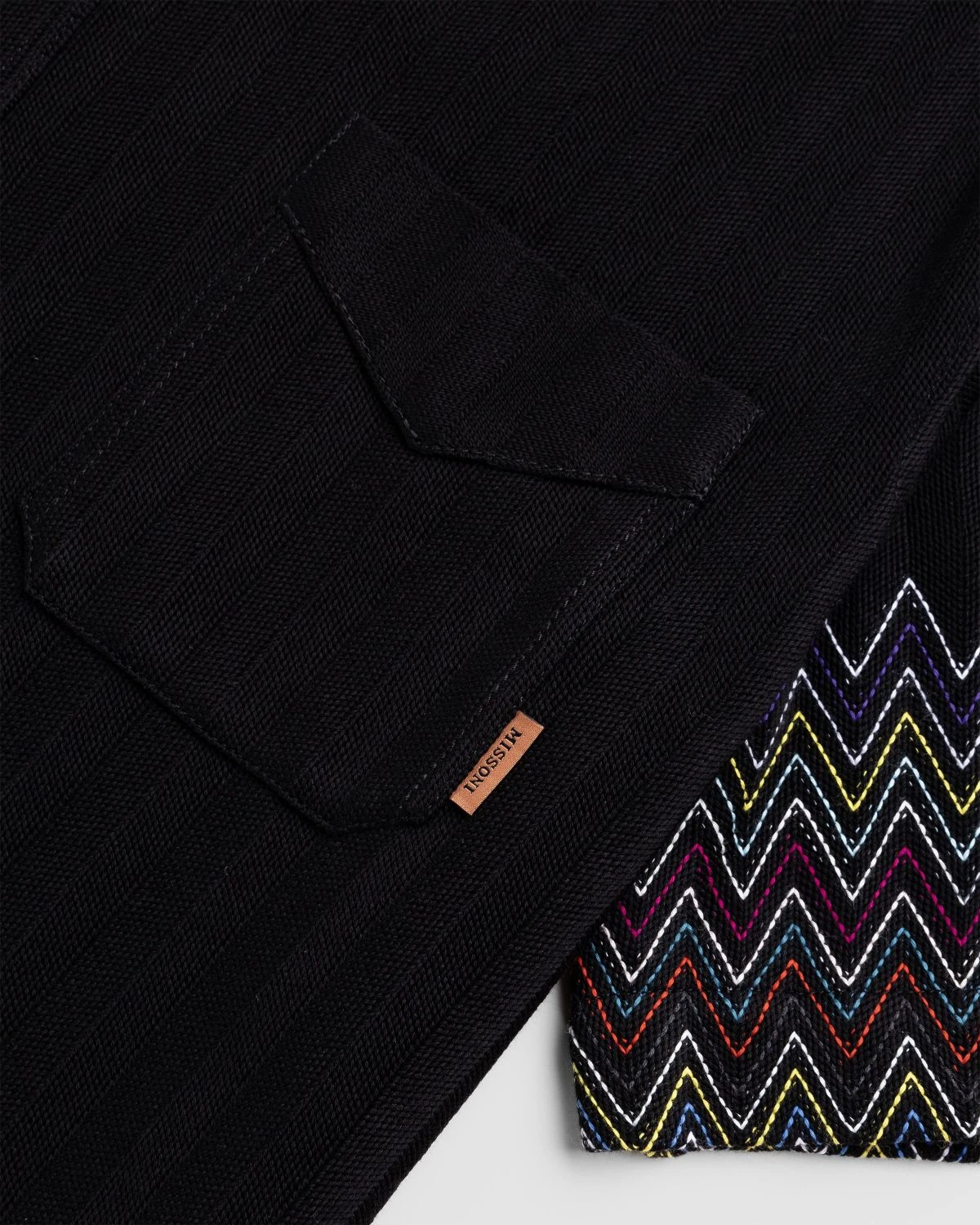 100% Cotton. Short-sleeved. Collarless. Multi Colored chevron pattern raschel knit. Pocket with a logo label. Press studs
