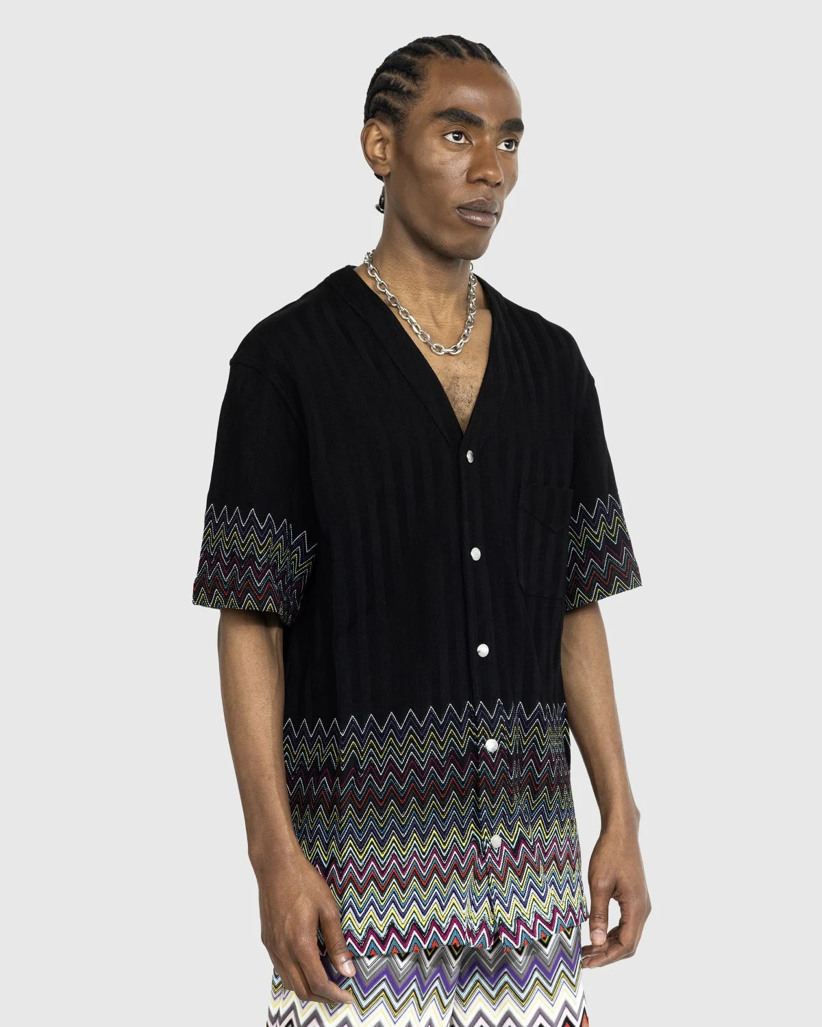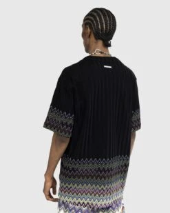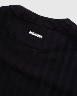 The knitted t-shirt is one of Missoniβs definitive tops that showcases the brandβs technical prowess in pattern making. Composed entirely using a raschel knitting technique known for its durable construction, the top is detailed with Missoniβs signature chevron pattern, a chest pocket with a discreet logo tag, and arrives in a collarless cut.