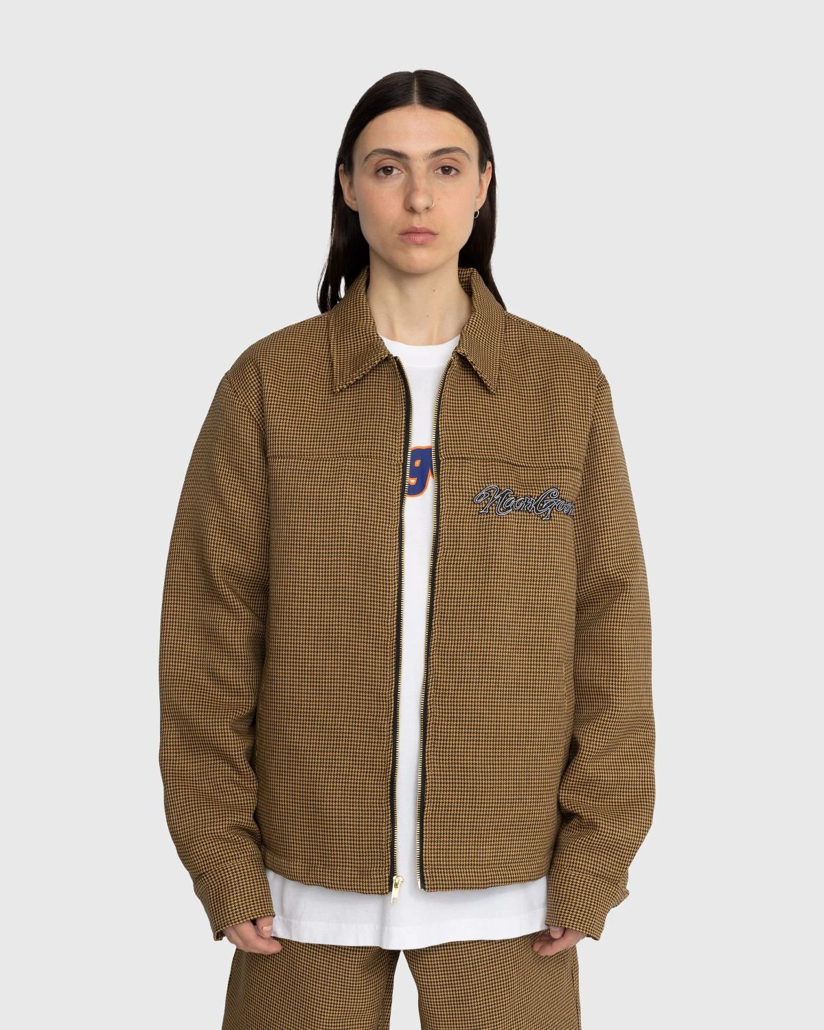 The Banned Houndstooth Jacket is a workwear-inspired style produced in 100% polyester on the outer, with quilted lining. In addition to showcasing a houndstooth pattern, the exterior of the garment is further embellished with Noon Goons logo embroidery at the chest. Other features include front zip closure and button cuffs that allow for minor adjustments, and single welt hand pockets as well as an interior patch pocket. The jacket is cut in a boxy fit that is true to size for a timeless look.
