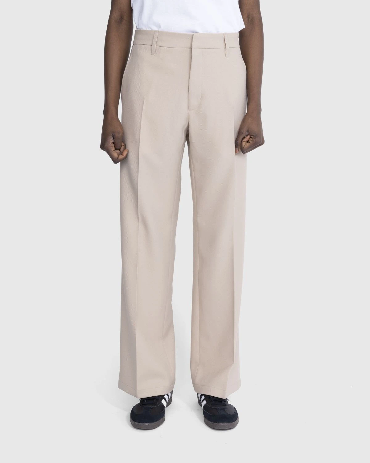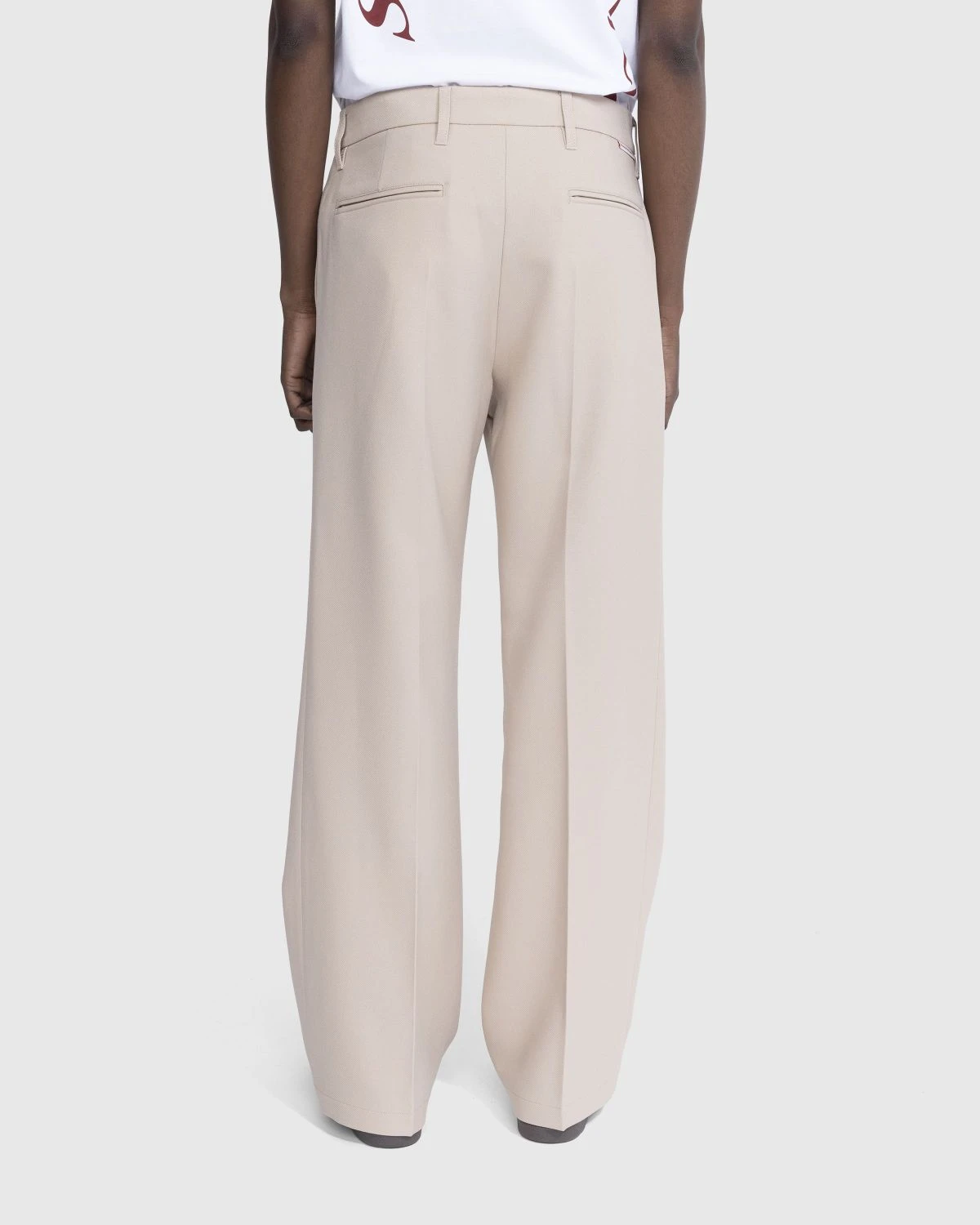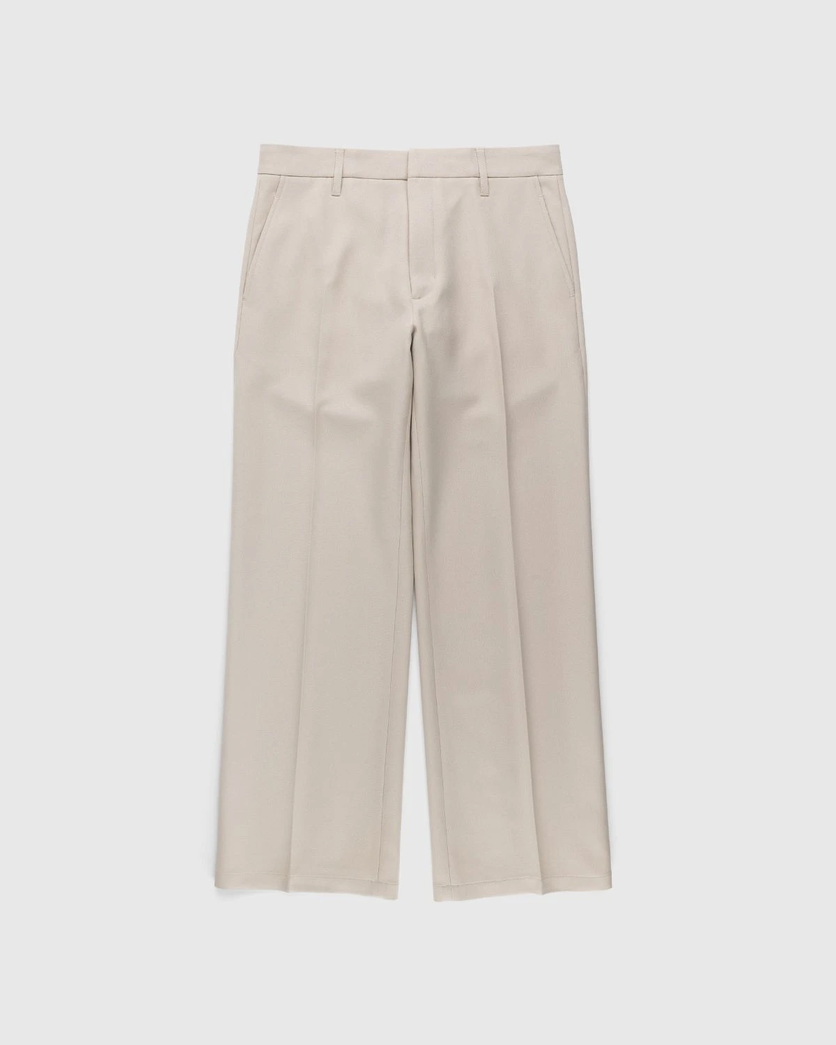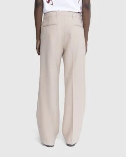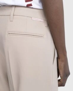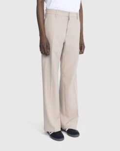The Bootcut Trouser is a lightweight dress pant style produced in British polyester. Cut in a regular fit with a wide bootcut leg, the sand-colored pair features front and back pleats, concealed fastening, belt loops at the waist, and front and back pockets. The style is minimally branded with a small logo label incorporated onto the back of the waist.