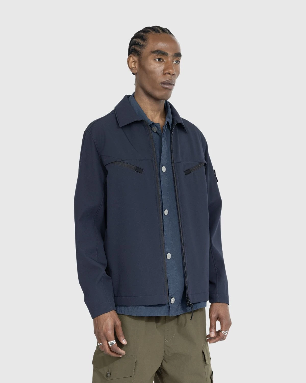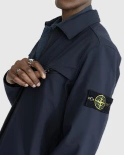 92% Polyester, 8% Elastane. 100% Polyester Lining. Waterproof. Windproof. Front two-way zip fastening. Side pockets Two zip-fastening chest pockets. Classic collar. Long sleeves. Buttoned cuffs and straight hem. Stone Island badge on the left sleeve.
