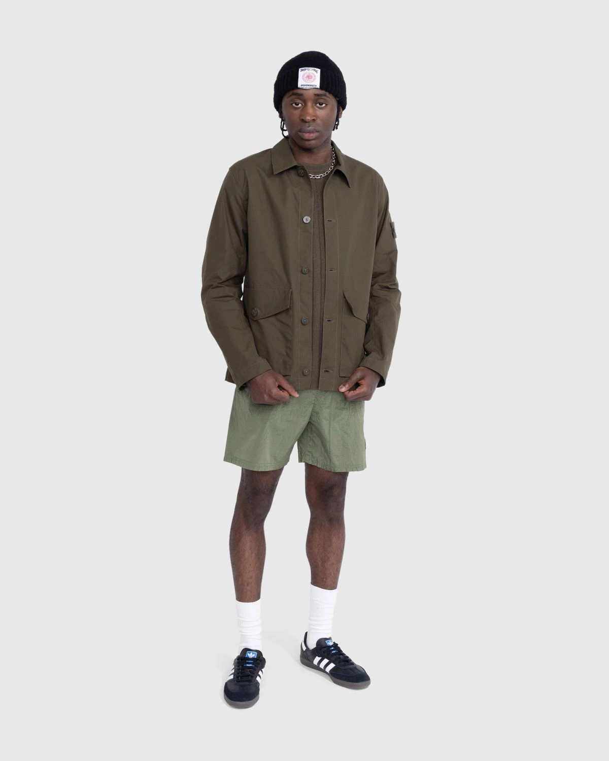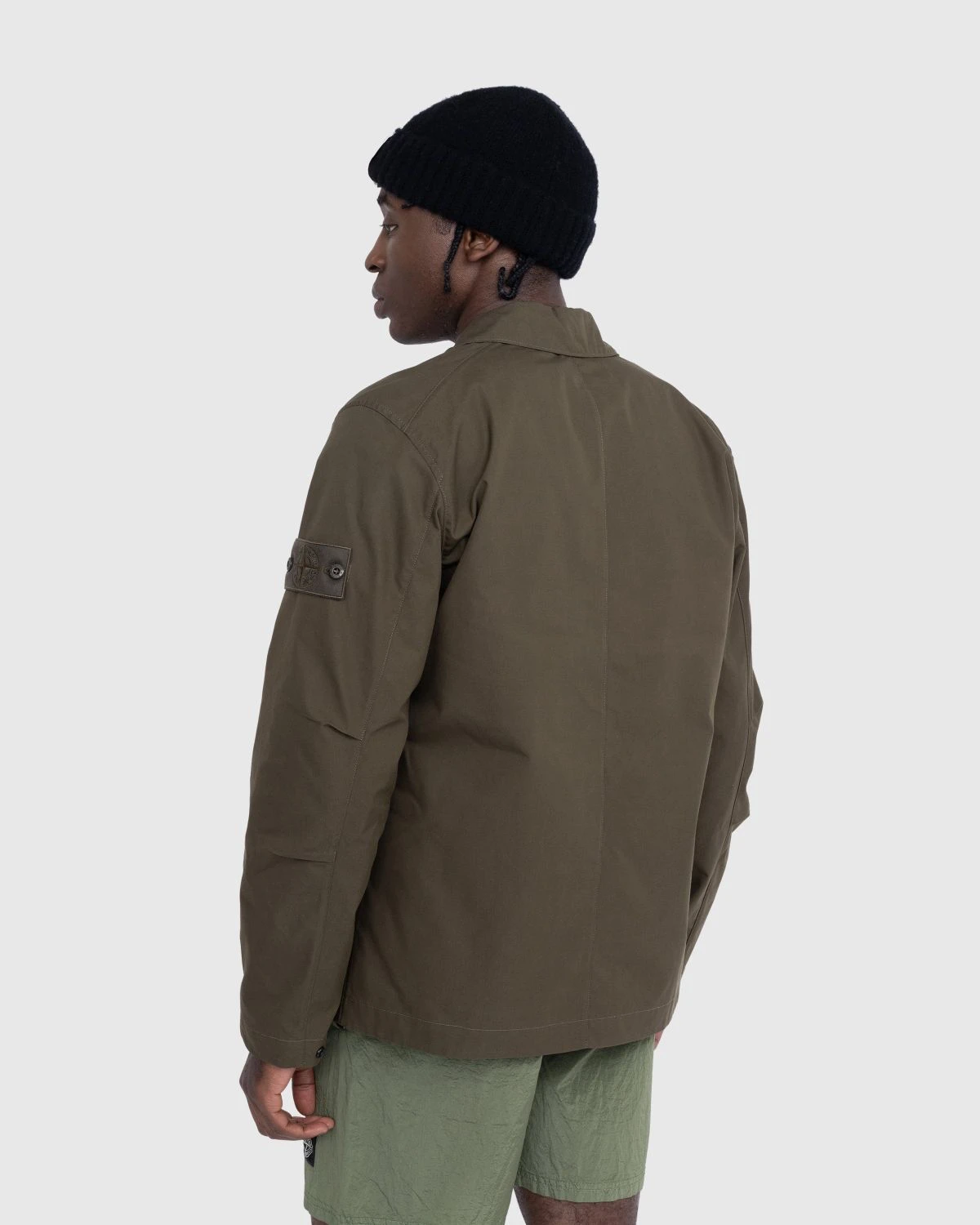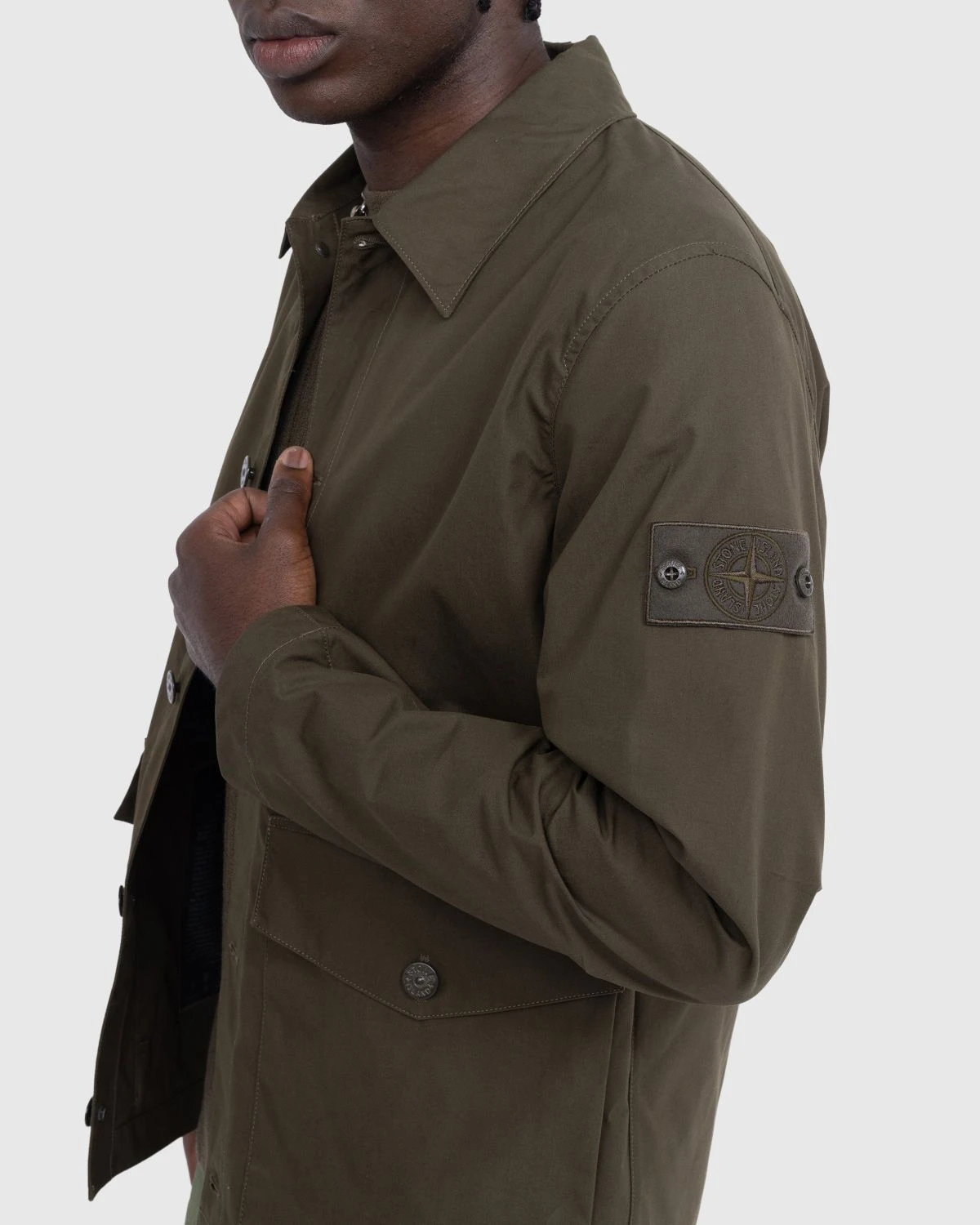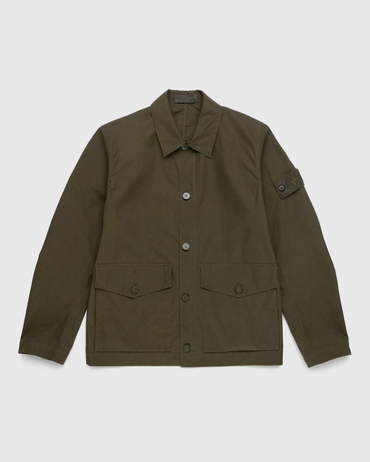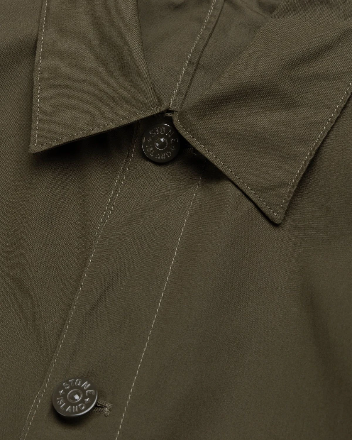 100% Cotton. Collar, overstitched on back, with small snap to wear it standing up. Patch hand pockets with flap and button fastening. Adjustable snap at cuffs. Button fastening. Windproof. Water-repellent. Stone Island Ghost badge on the left sleeve.