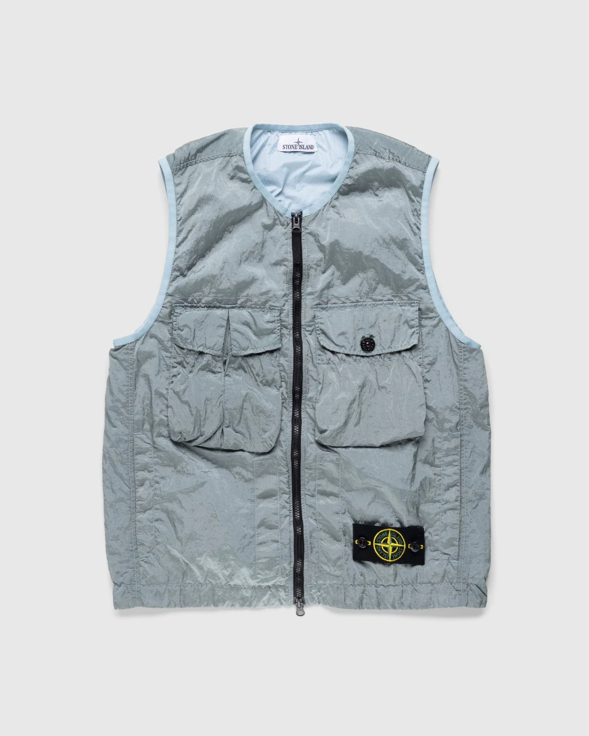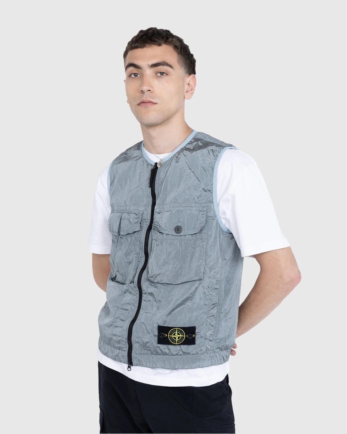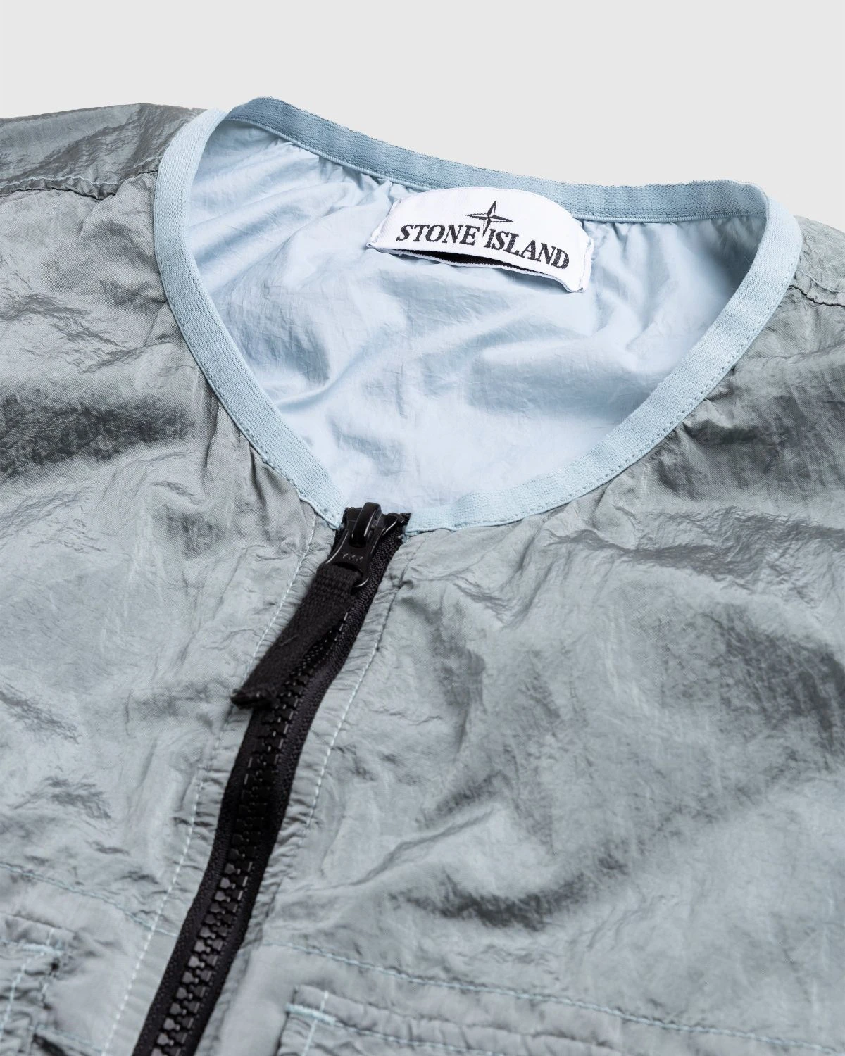 External fabric: 100% Polyamide. Lining: 100% Polyester. Garment-dyed. Neckline and armholes edged in elasticized nylon tape. Two chest pockets: bellows pocket on the right side divided in two sections, each one with flap and hidden snap fastening, regular bellows pocket with flap, and button fastening on the left. In-seam hand pockets with hidden snap fastenings. Two-way zipper fastening, inner elasticized tape appliqués on sides. The lower left front features the Stone Island badge.