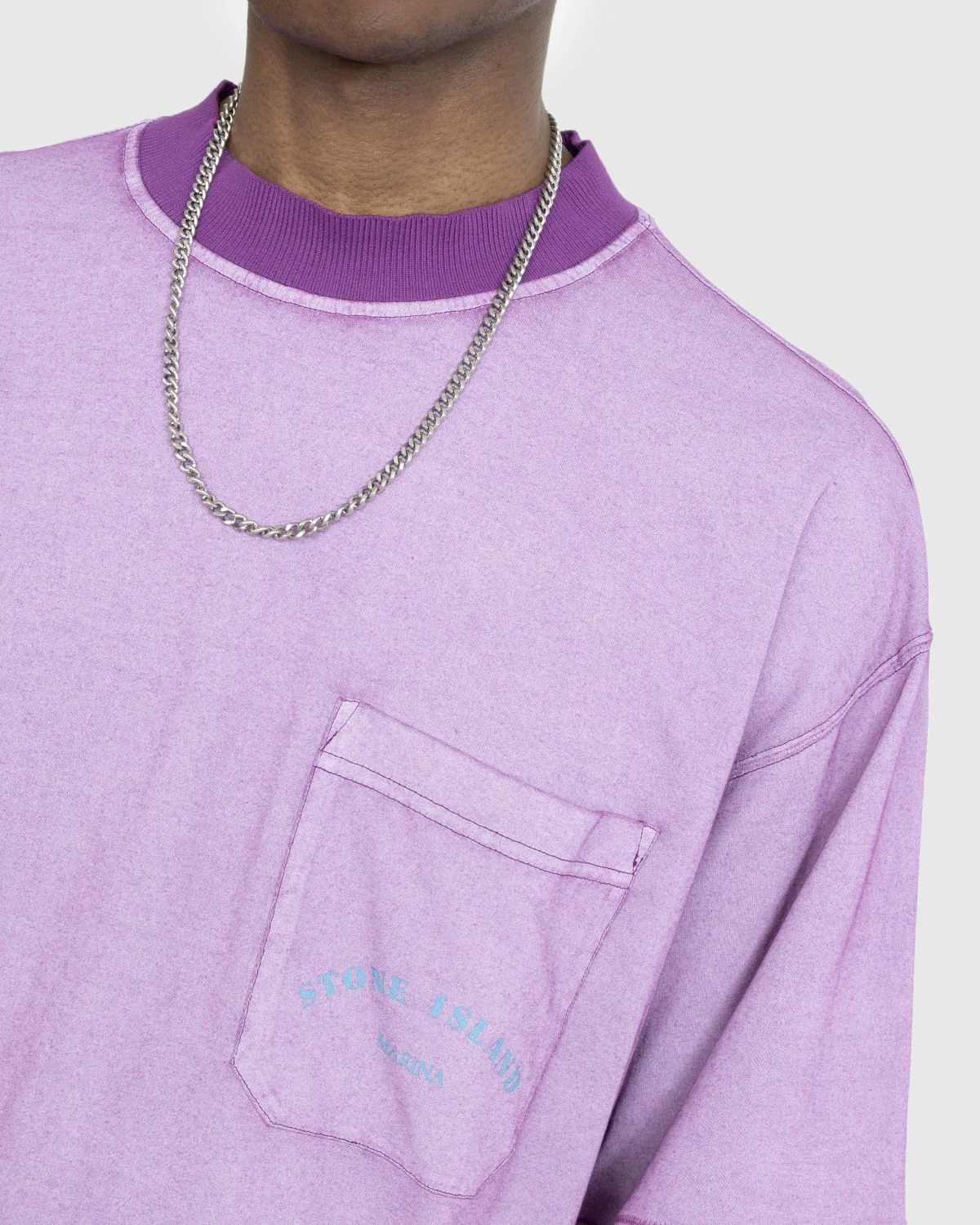 100% Cotton. Garment-dyed. Ribbed neckline. One patch chest pocket, featuring the reflective Stone Island Marina lettering.