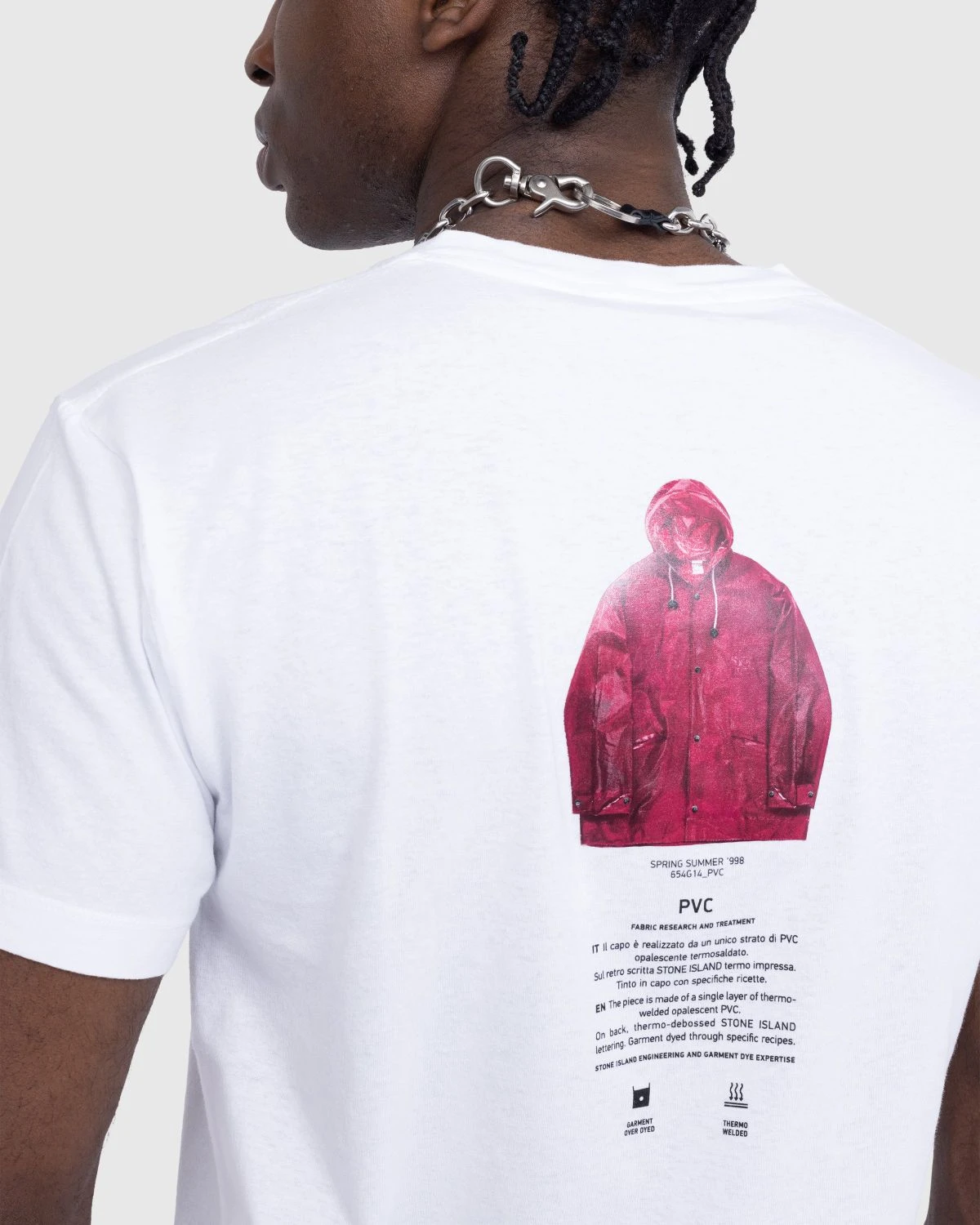 Stone Island continues to add to its ever-growing Archivio project that chronicles the brand’s textile research and innovation. This particular t-shirt features a printed Stone Island logo on the chest along with Archivio embroidered underneath. On the back sees one of the brand’s PVC jackets from its 1998 collection along with a piece of the same fabric attached in the window of the swing tag.