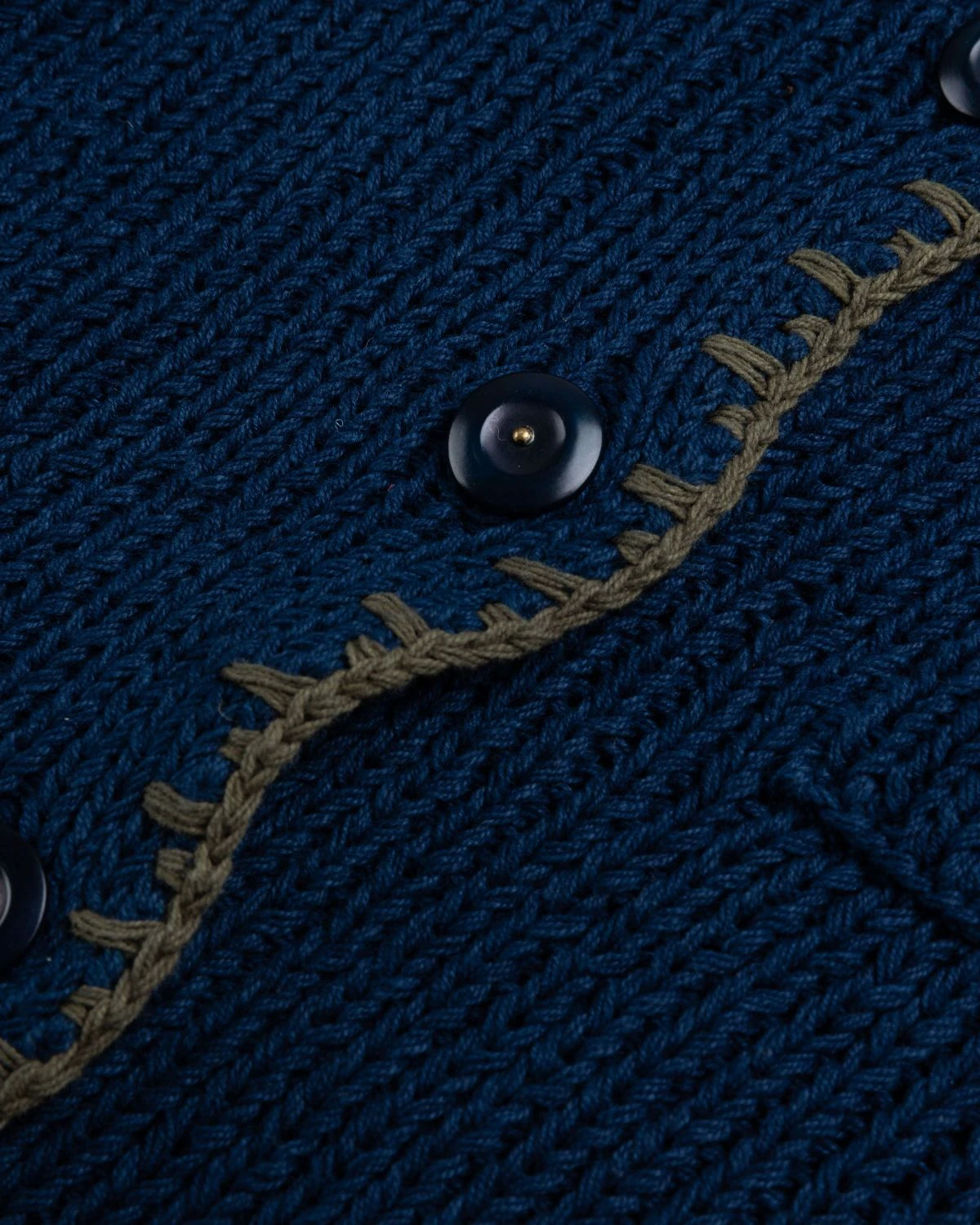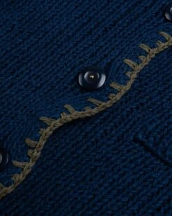 Rib hand knitted using 100% organic cotton. Naturally dyed. Stitched and crochet edge detail. Oversized collar. Button closure. Corozo nut buttons. Three pockets at the front.