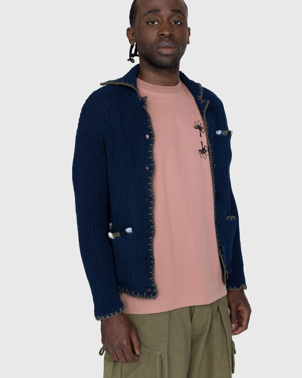 Like many Story mfg. garments, the Grandad Cardigan is rib hand knitted using 100% organic cotton which has been naturally dyed. It is detailed with stitched and crochet edging, while featuring an oversized collar and a trio of pockets on the front of the sweater. Corozo nut buttons line down the center of the silhouette, which is cut for a drapey fit that hangs loosely off the shoulders. Due to the hand knitting, the cardigan will grow with wear.