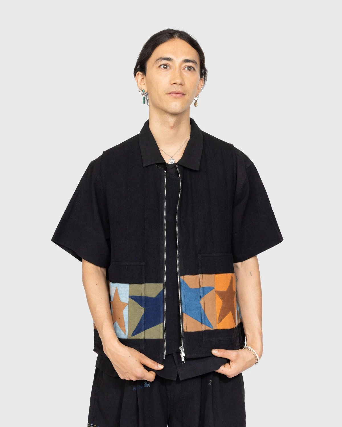 The Saturn Vest is made from all-organic cotton, inside and out. The outer is hand-dyed with myrobalan (kaduka) and iron and features a patchwork band of naturally dyed fabrics. The vest is padded with light organic cotton wadding, as additional details include two-way zip closure and large front pockets.
