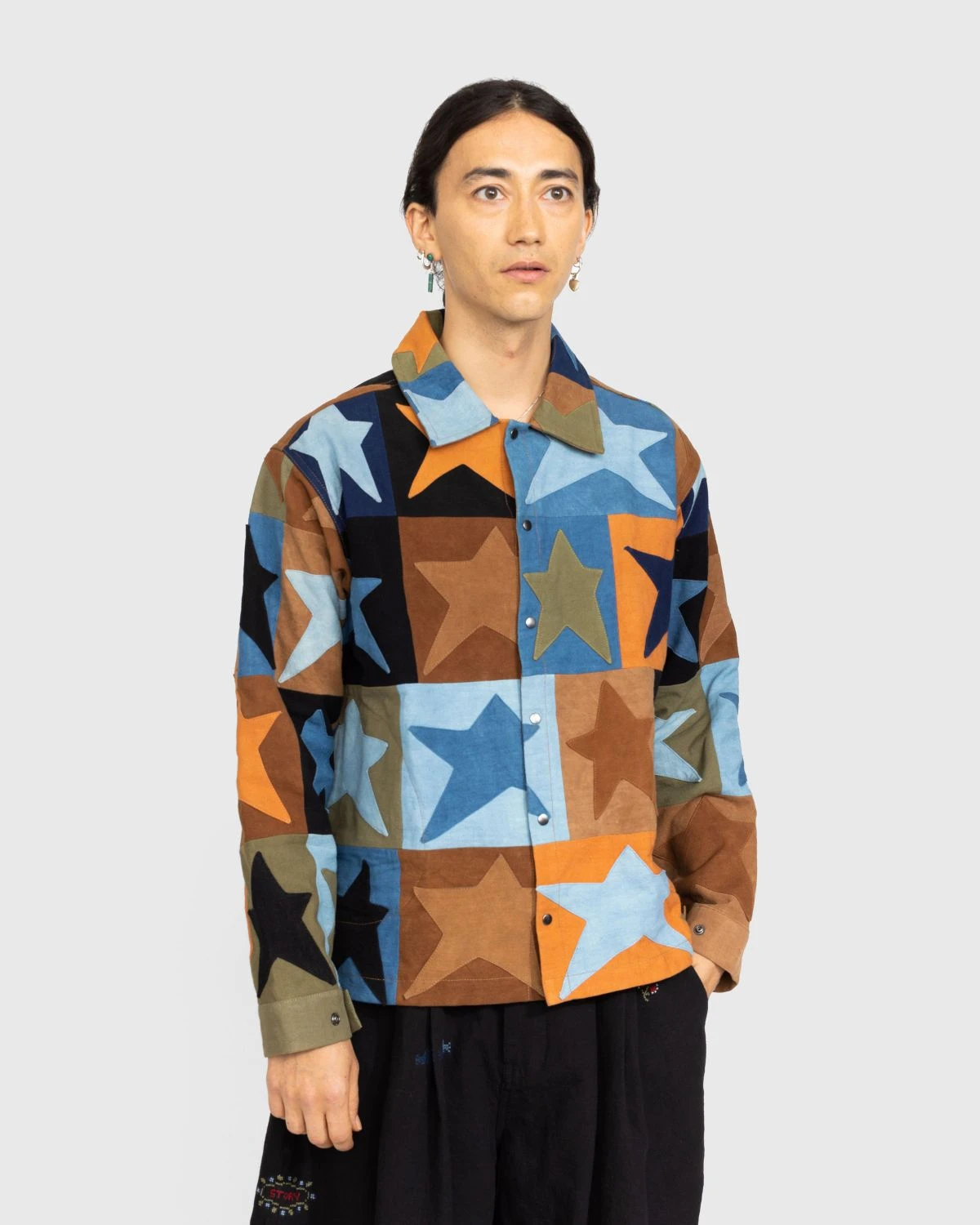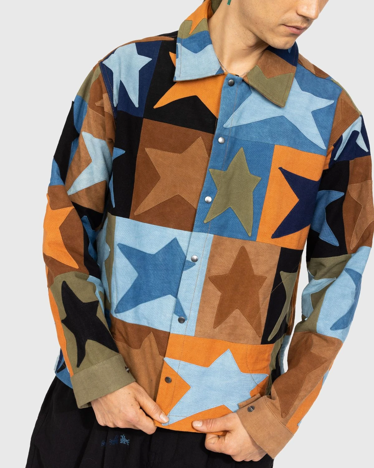Story mfg. transforms the coach jacket style by patchworking this unique model entirely from naturally hand-dyed fabrics. Metal popper fastenings line down the center front, as they are also utilized for the adjustable cuffs. Cut for a classic boxy fit, the Worf Jacket is finished with pockets at each side.