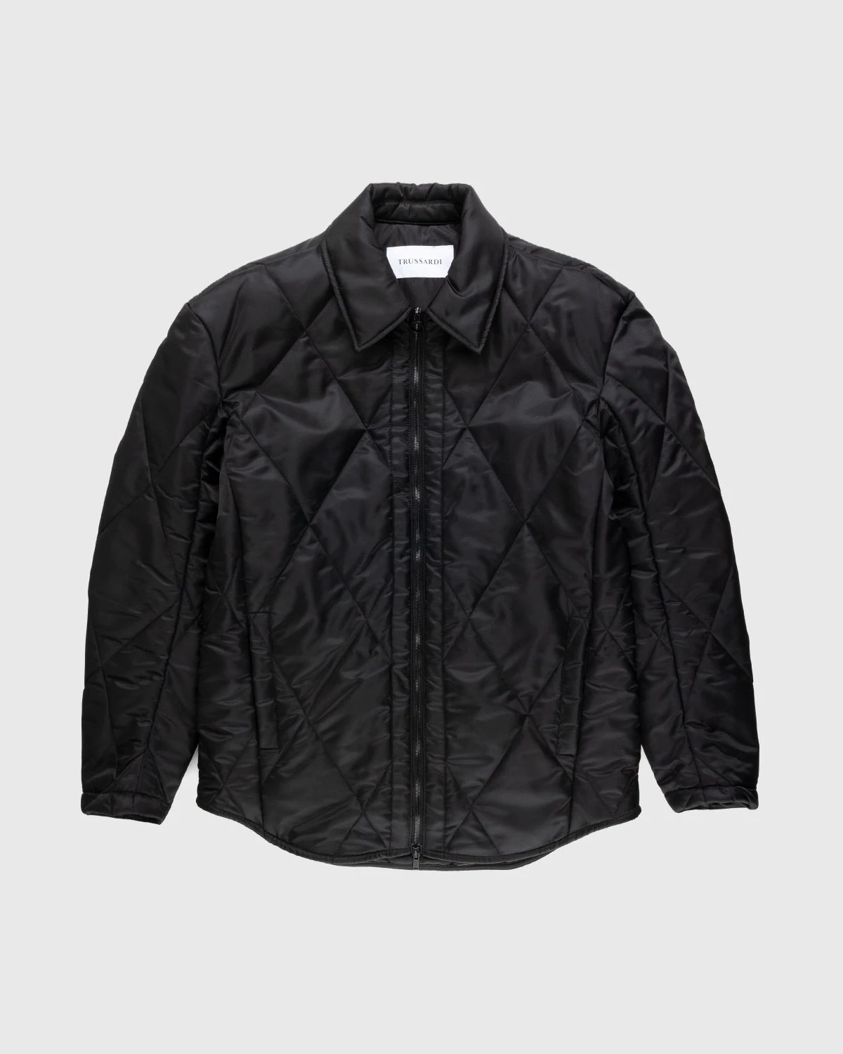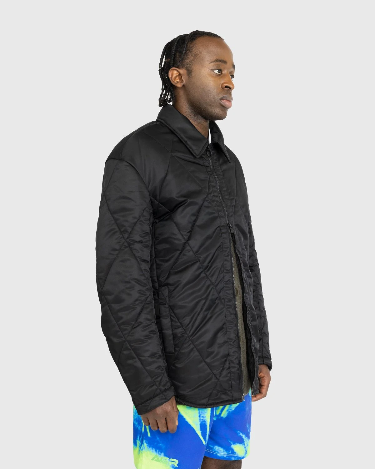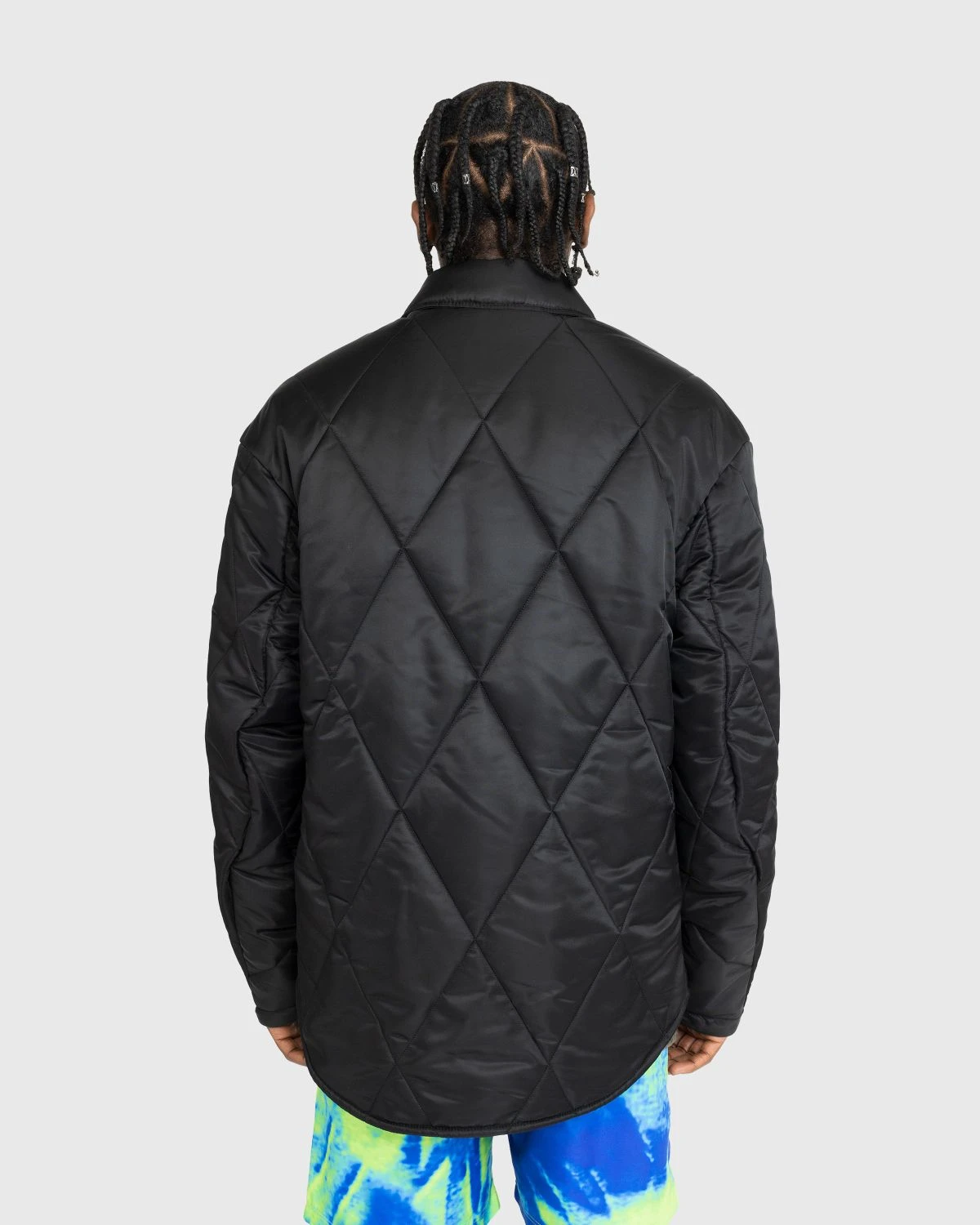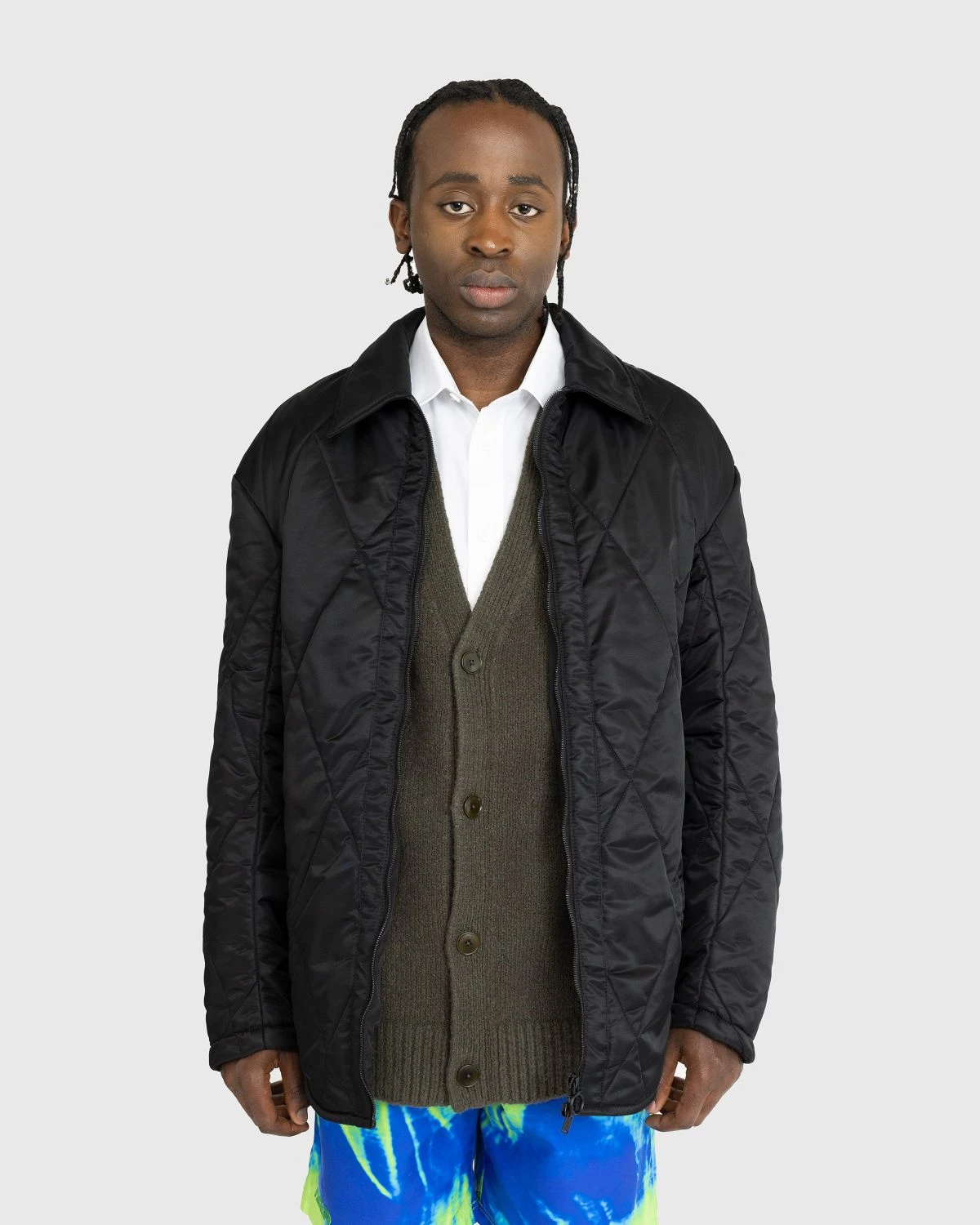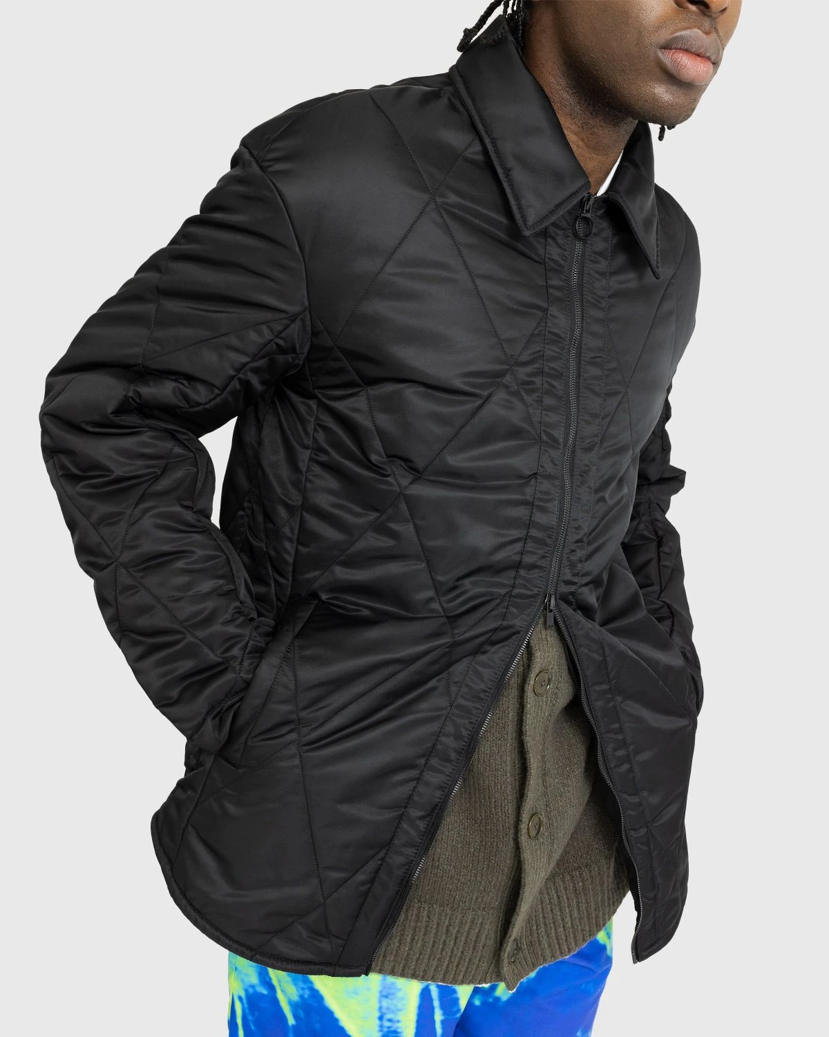 This stealthy down jacket is produced in a midweight non-stretch nylon fabric, with polyester padding for increased comfort and warmth. It features distinctive diamond quilting, while being outfitted with two-way zip fastening that allows for minor adjustments to styling. Additional details include a flat pointed collar, curved hem, and side slip pockets, as the silhouette is cut for a loose fit to make way for layering in colder temperatures.