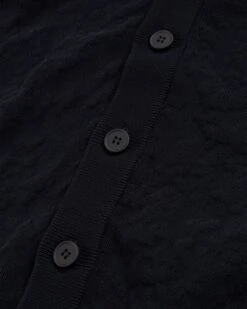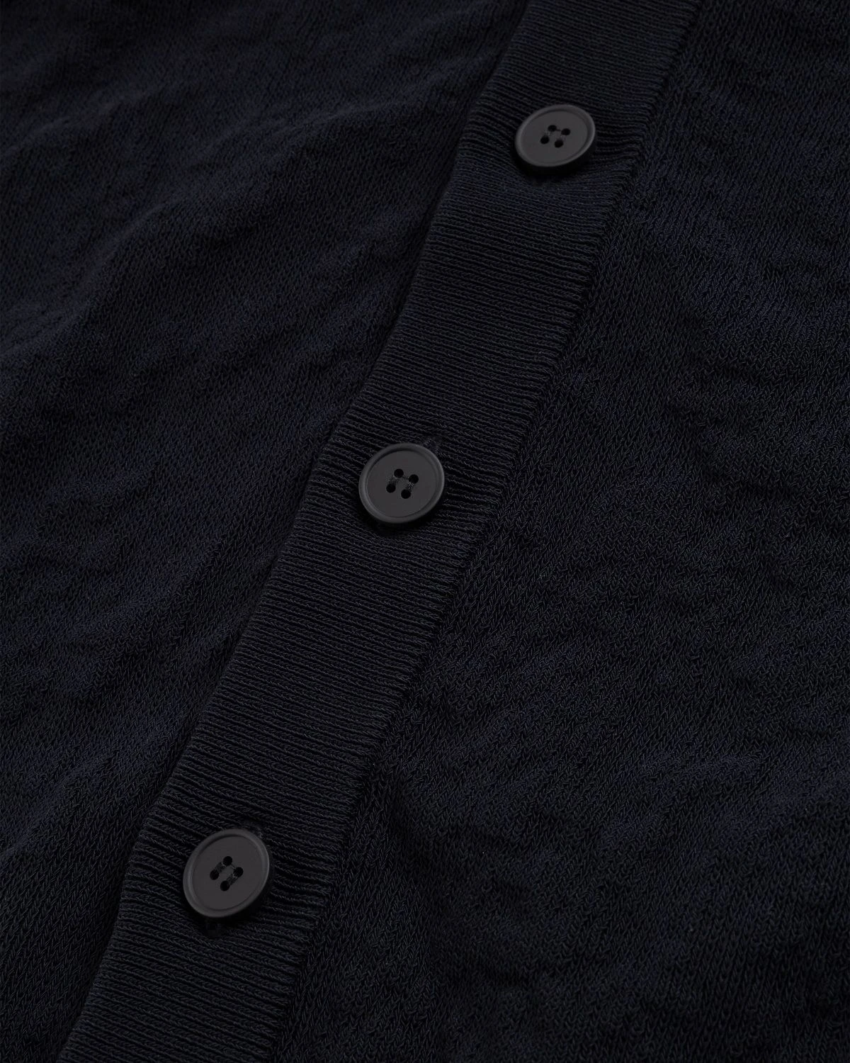 57% cotton. 43% nylon. V-neck. Dropped shoulders. Button closure.