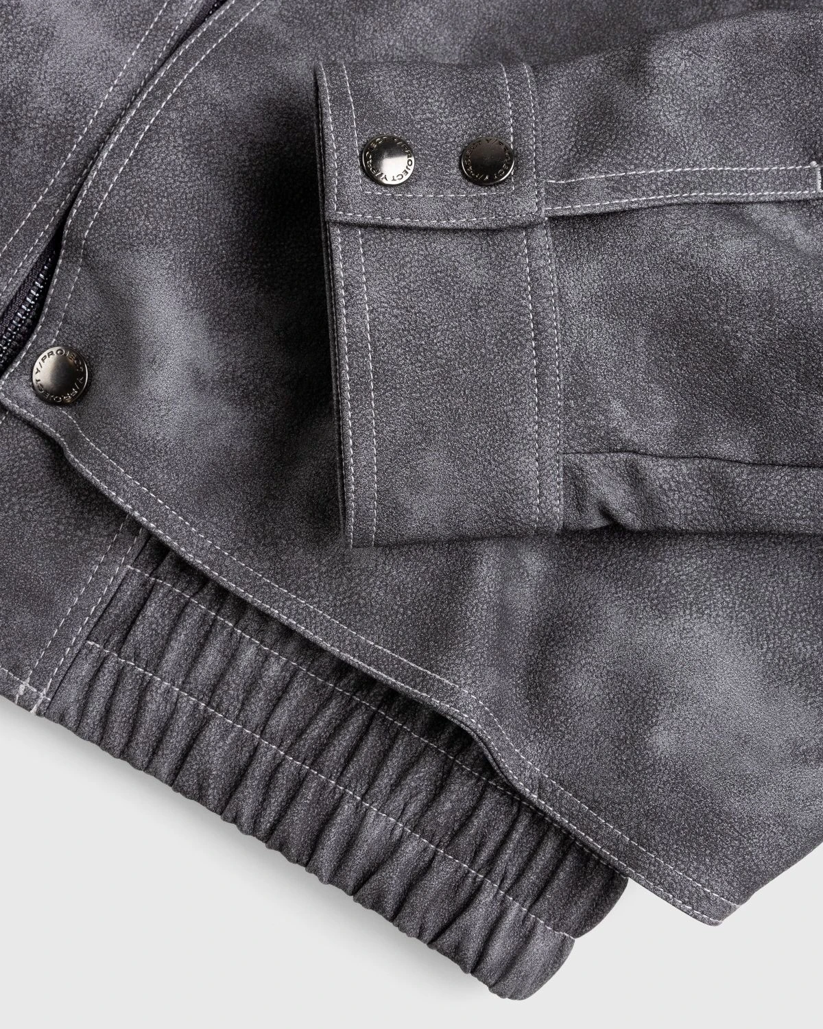 Main material is 100% polyurethane. Heavyweight non-stretch fabric. Back is 91% polyester, 8% cotton, and 1% viscose. Lining is 100% viscose. Paneled design. Zip closure. Button detail. Classic collar. Button cuffs. Elasticated hem.